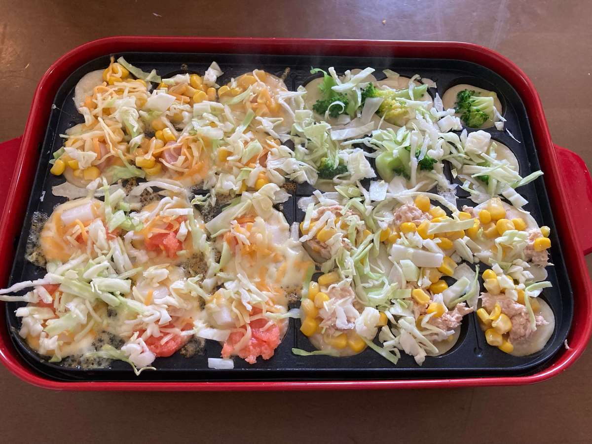 miyayuki98さんは、たらこ×もち×チーズ、ウインナー×コーン×チーズ、ツナマヨ×コーン、ブロッコリー、ねぎ、キャベツという、子どもにウケがいい具を用意してたこ焼きパーティーを開催!