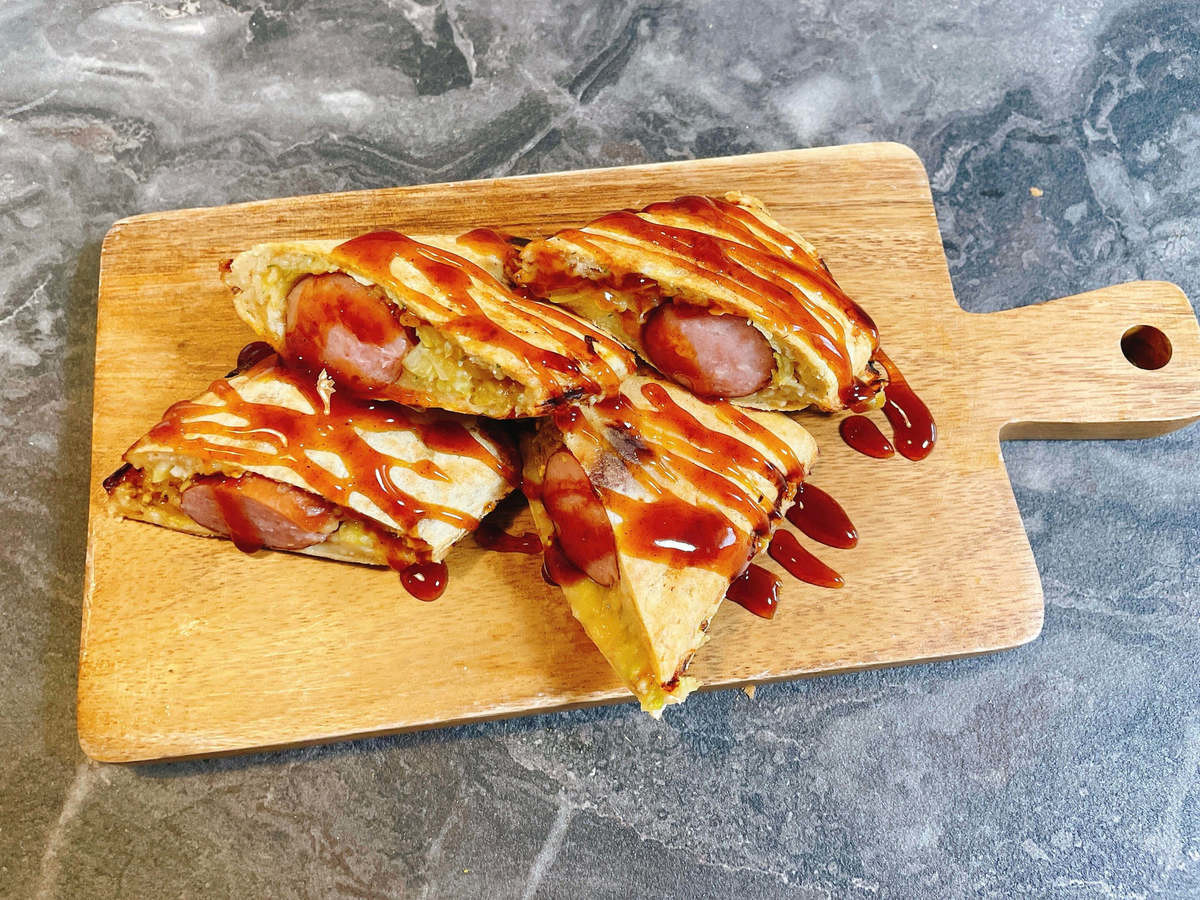 yuyuchaaaan322さんは、アウトドアでも人気の高いホットサンドメーカーを活用。お好み焼きの生地に、太めのウインナーとせん切りキャベツ、粒マスタードを合わせてバーベキュー風のコナモンを作ってくれました♪