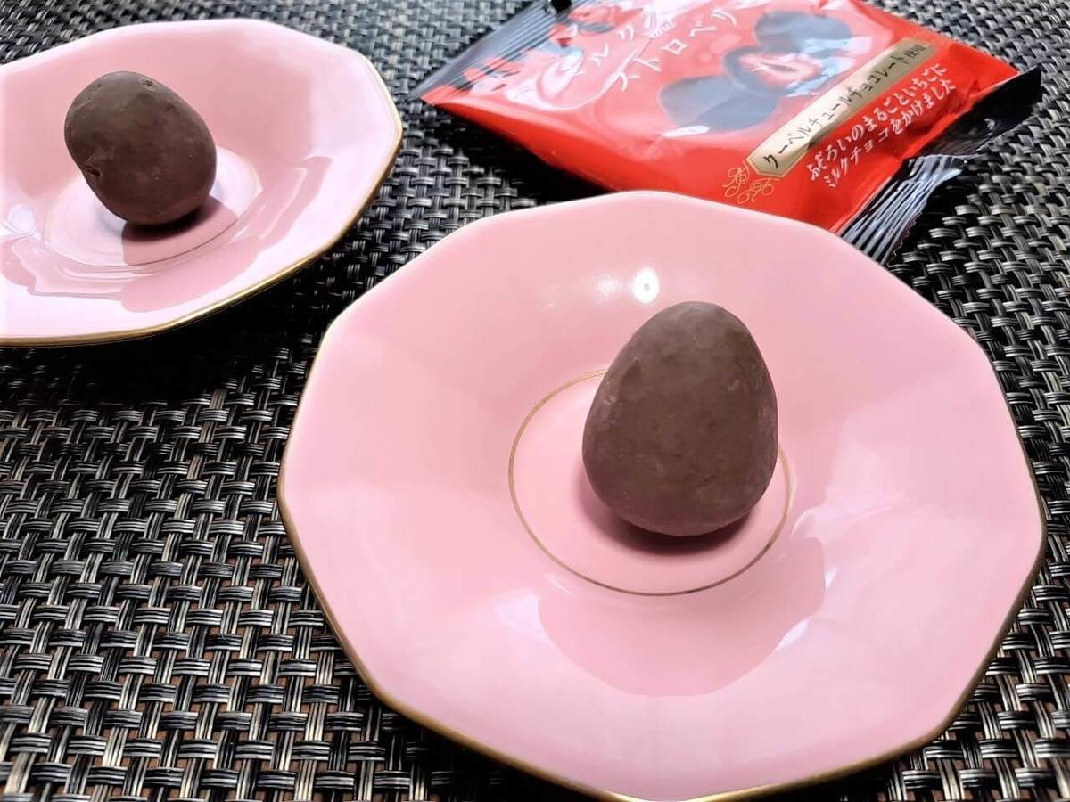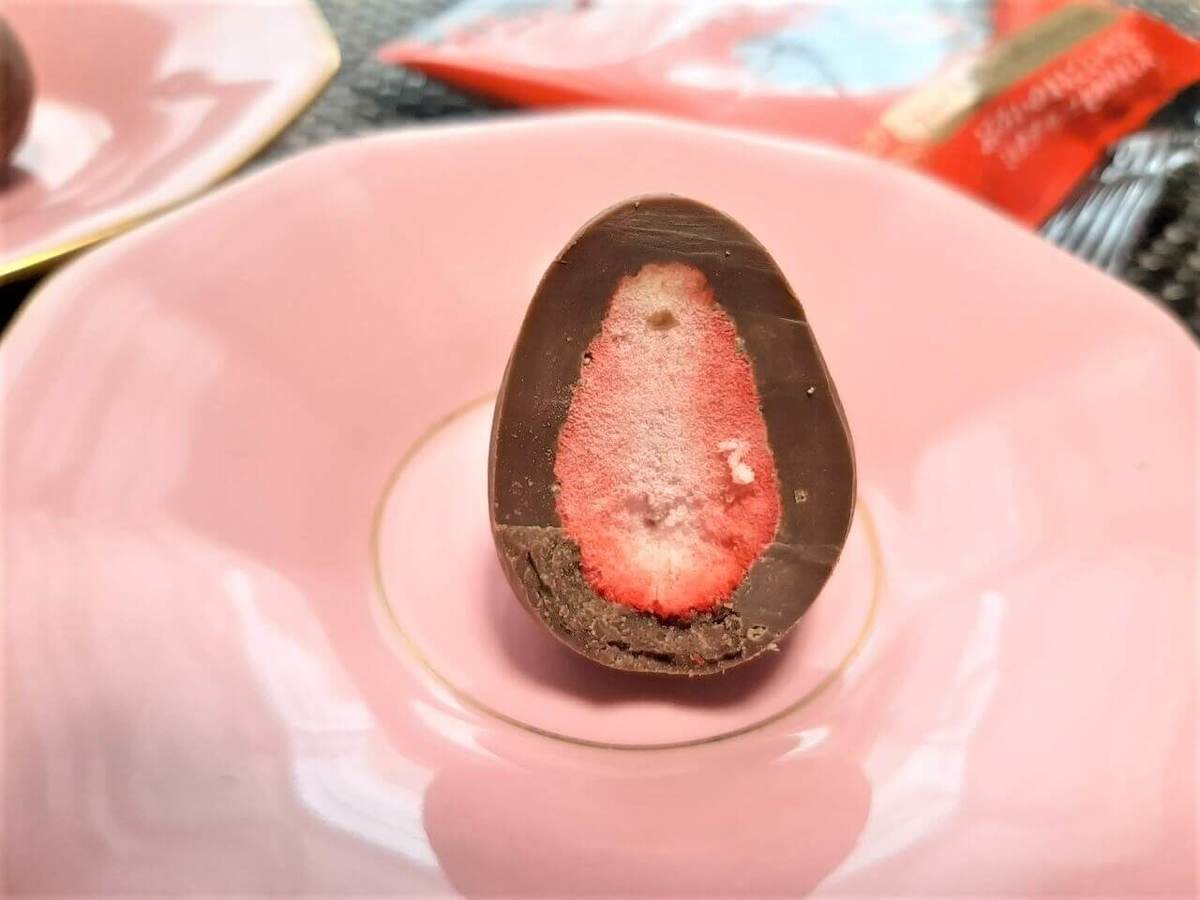 カットした中身を見るとわかるのですが、本物のドライ苺を丸ごとチョコレートに入れているんです。