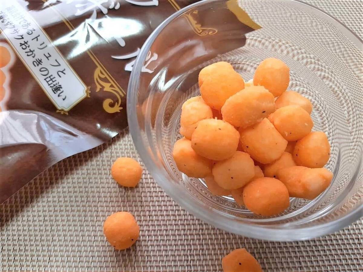 このトリュフチーズボールは、サクサクの小粒おかきにチーズの濃厚パウダーとふんわり香るトリュフ風味が病みつきに!
