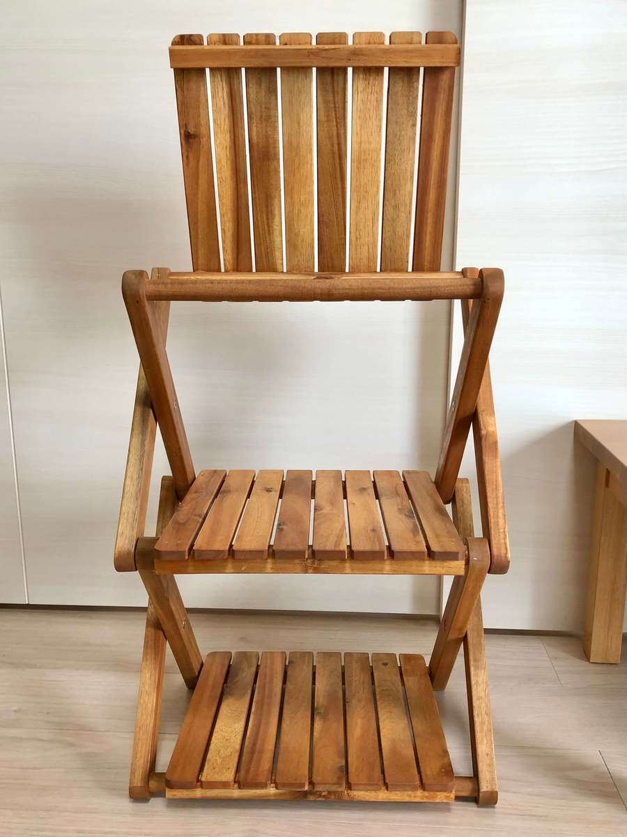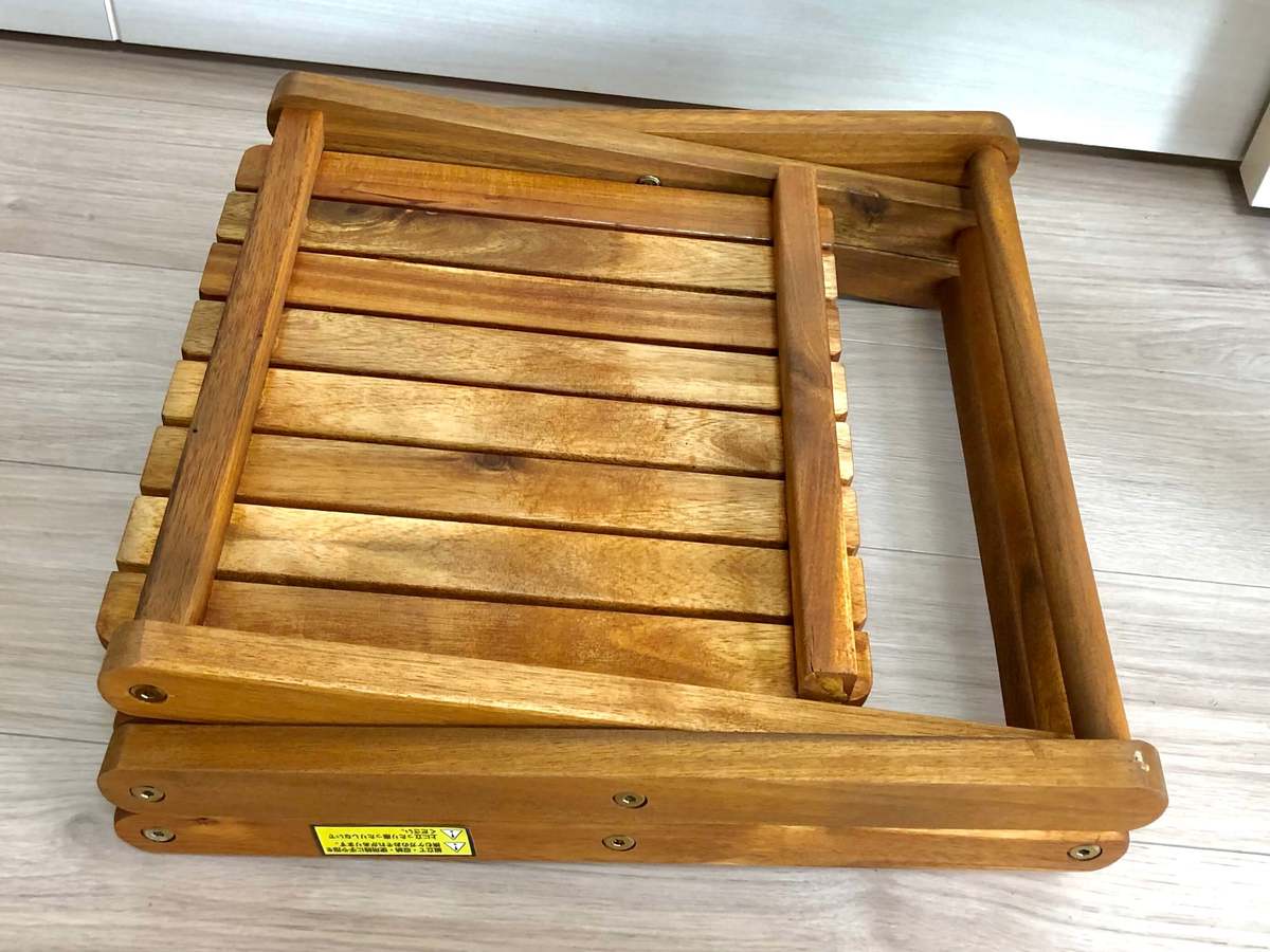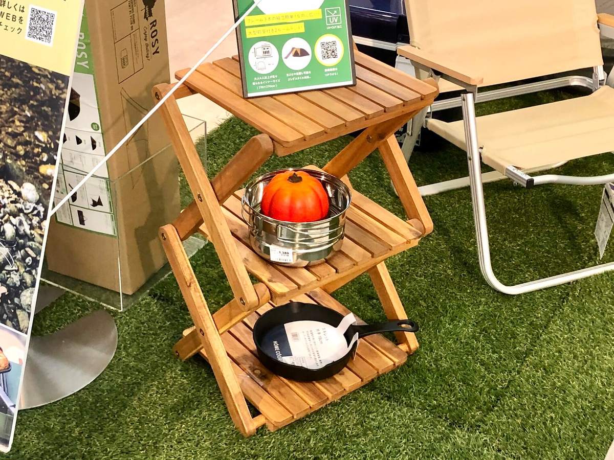 折りたたみ式なので、キャンプ場に持っていくことも可能。私はべランピング用に入手しましたが、冬以降は飾り棚として室内で使用しています。