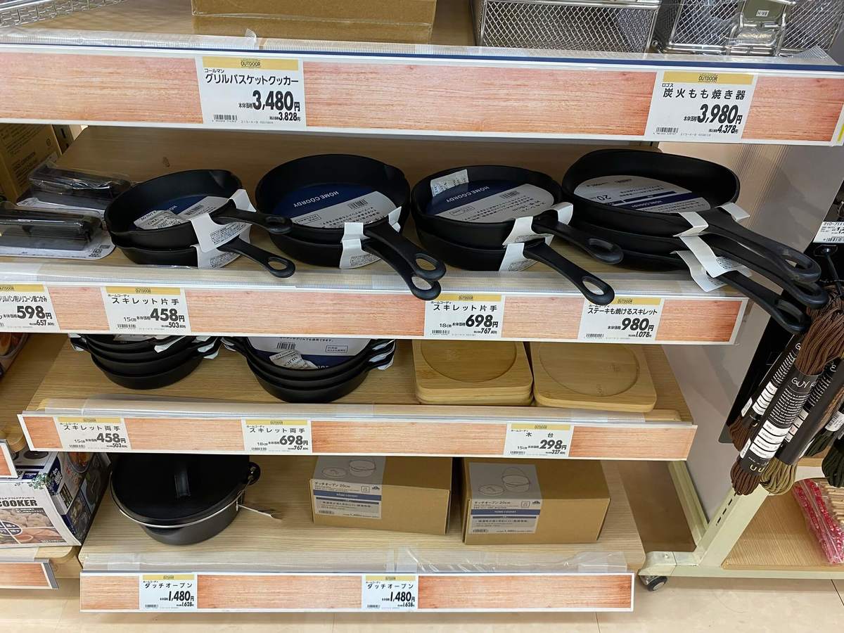実際、キャンプ用品の隣の棚にはダッチオーブンやスキレットが販売していました。これはイメージがしやすい…!