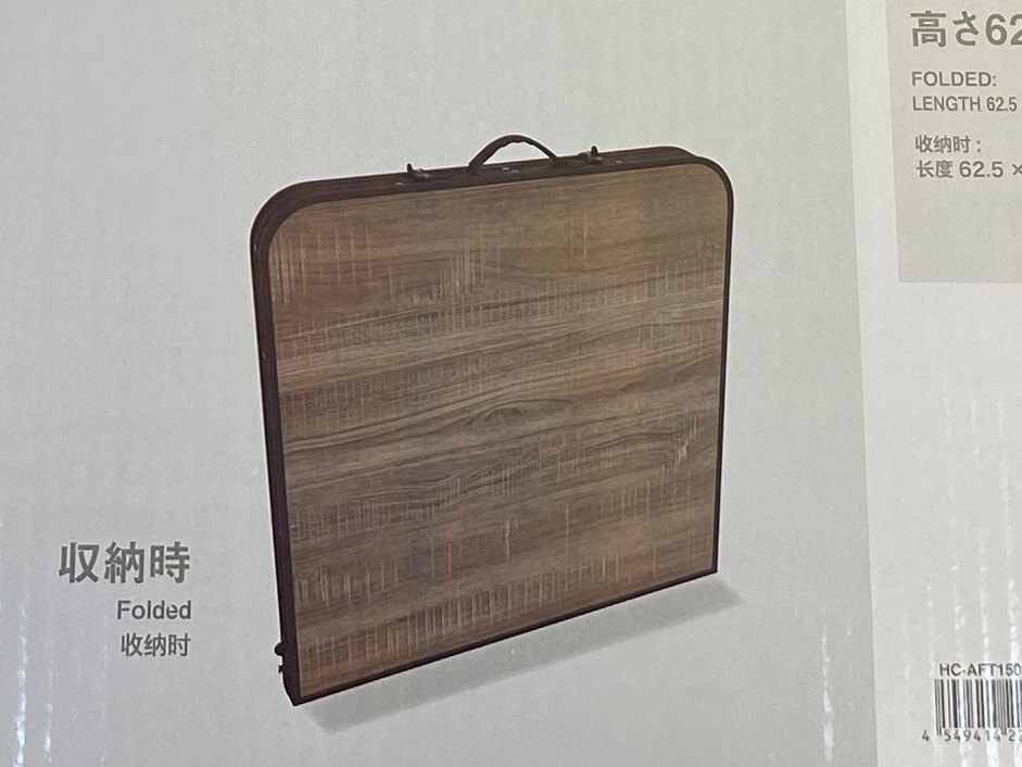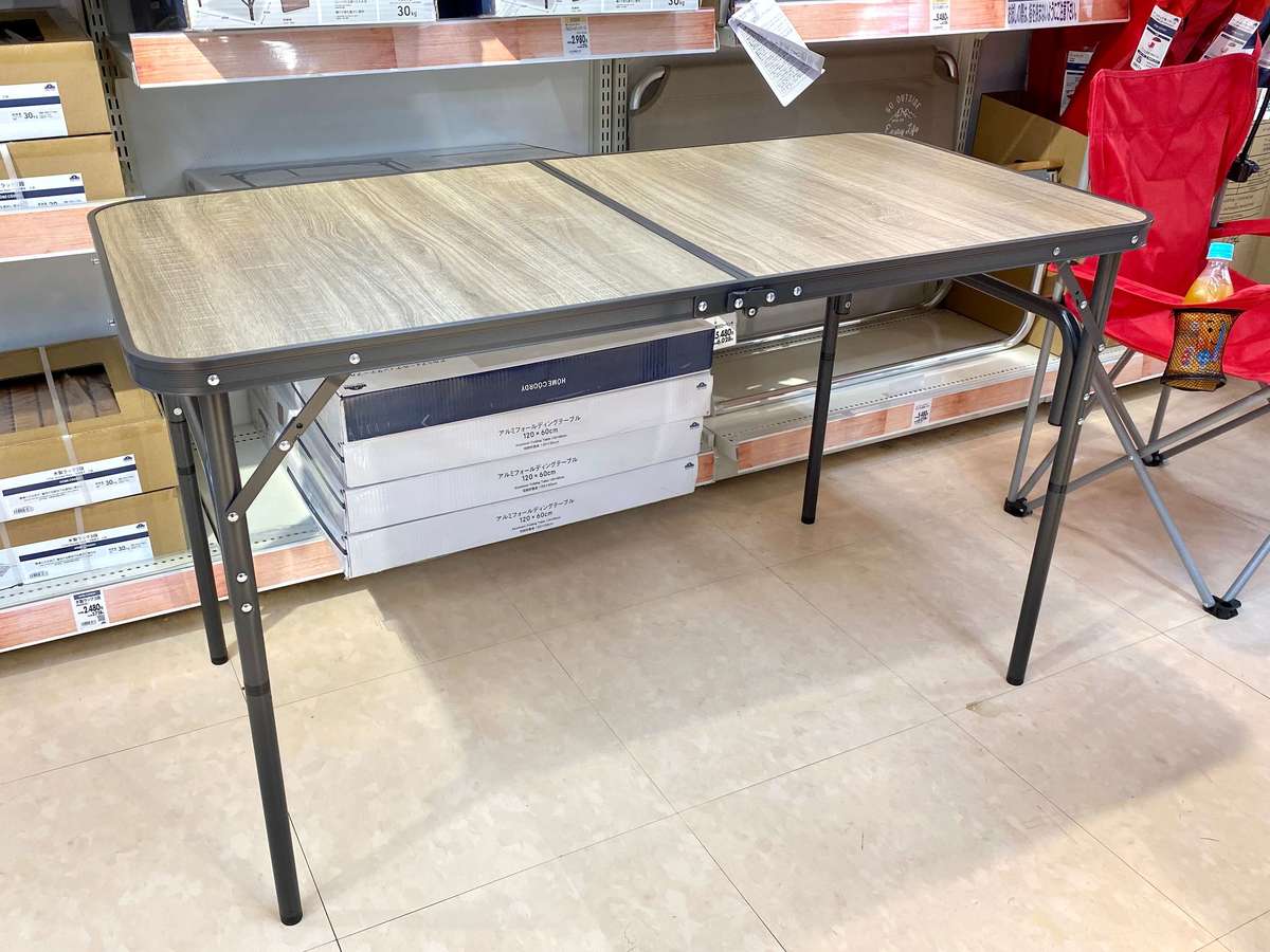 まずは、新発売の「ホームコーディ アルミフォールディングテーブル」から。組み立てて使用するタイプのテーブルです。真ん中で折りたため、取手もついているため、持ち運びもしやすいのがGOOD!