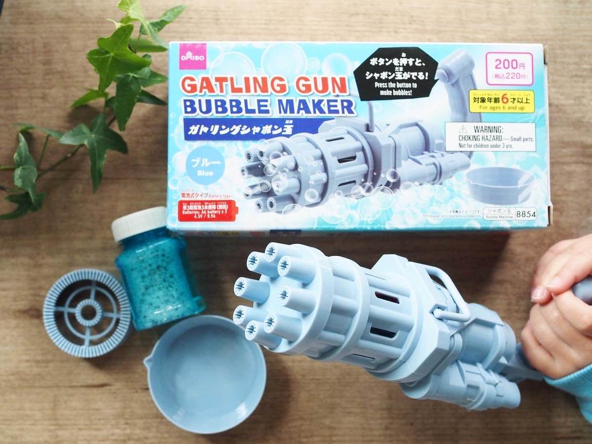 近年人気の電動シャボン玉ですが、ダイソーで「ガトリングガン」型を発見!電池を入れておけば、ボタンを押すだけで自動で大量のシャボン玉が出てくるので、外遊びで楽しめること間違いなし♪