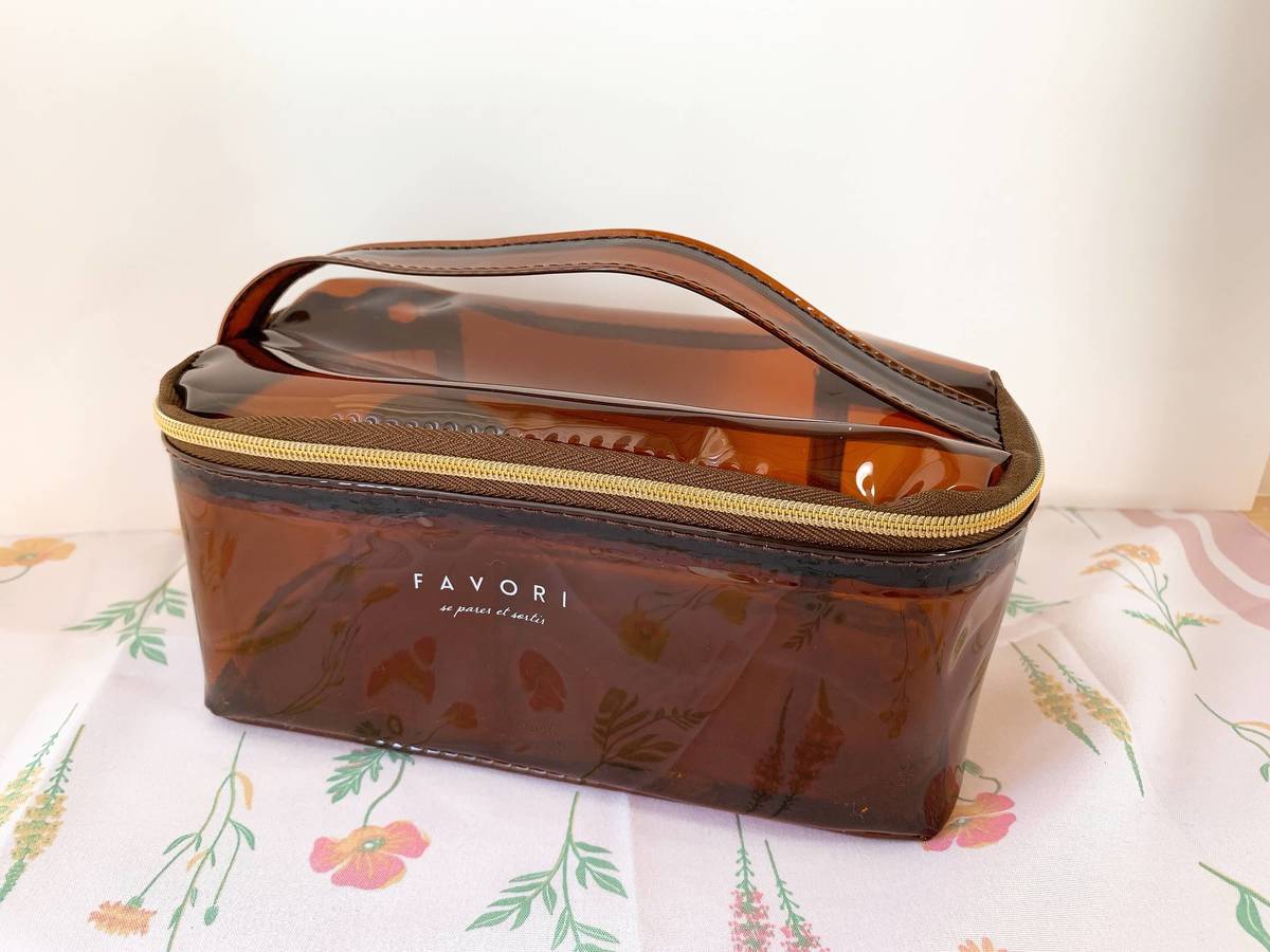 小物やメイクポーチ入れにピッタリの「バニティポーチ(110円 税込)」。中身がちょっと透けて見えるブラウンカラーがおしゃれで、高見えします♡