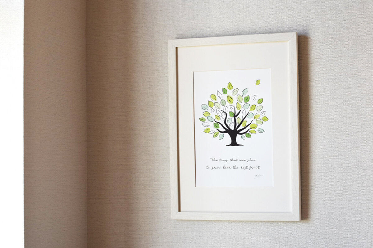「ゆっくりと育った木は、最高の果実をつける」のメッセージは17世紀フランスの劇作家モリエールの言葉だそう。急がずにひとつひとつ努力を積み重ねると、必ず大きな花を咲かせるでしょう。というメッセージです。