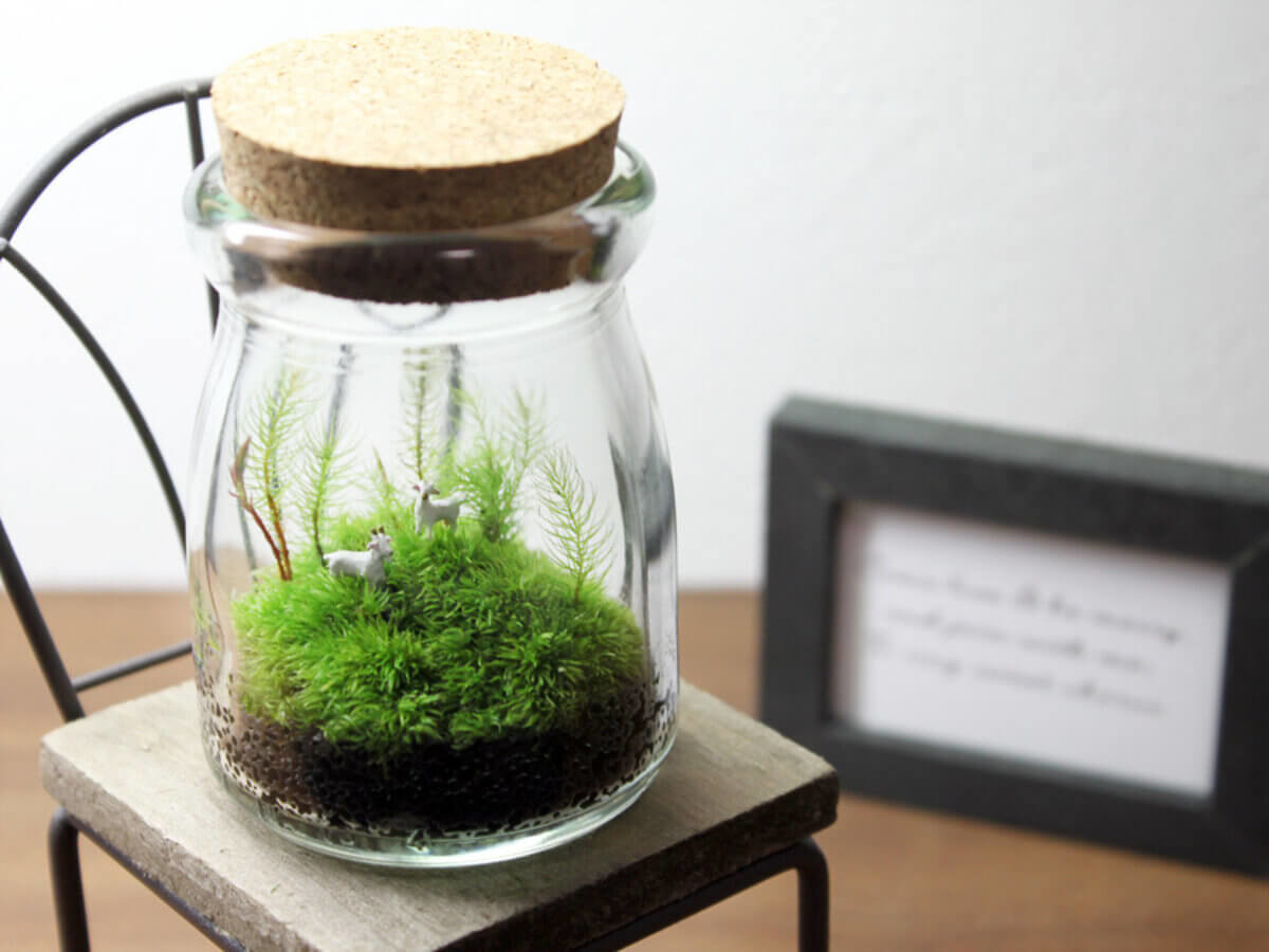 生きている苔とはいえ、瓶の中は苔に最適な環境なため2~3週間に1回水を振りかけるだけで◎。蛍光灯の光でも成長するので置く場所も限定されずにインテリアとして楽しめるテラリウムです。