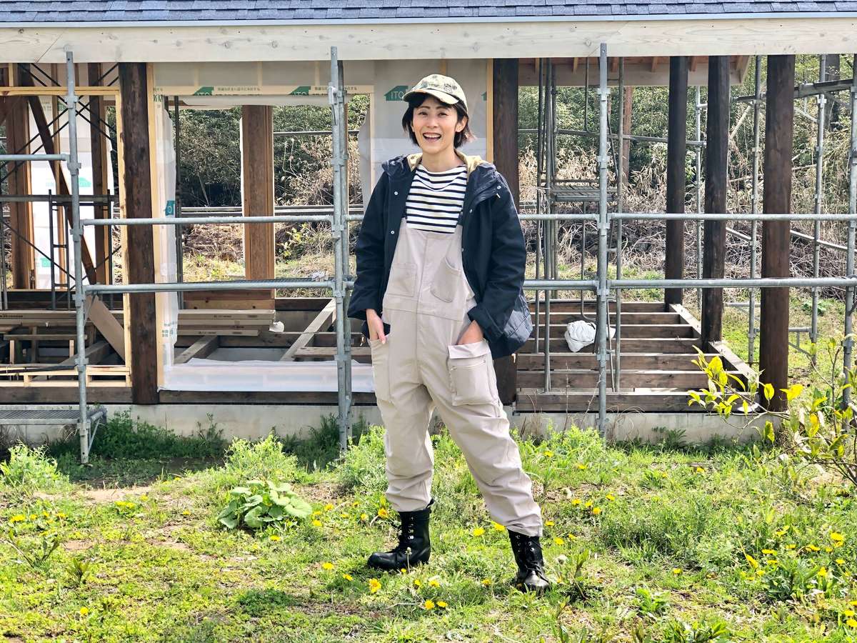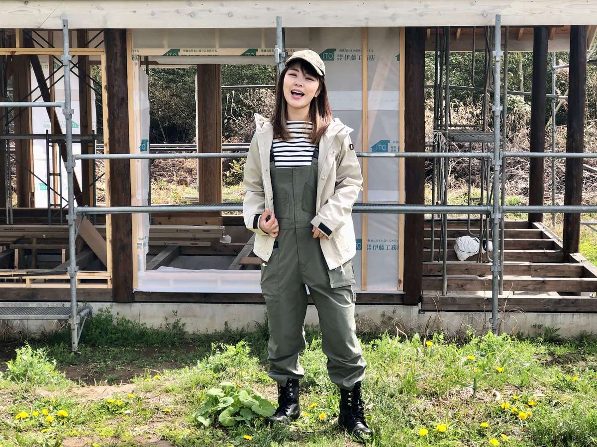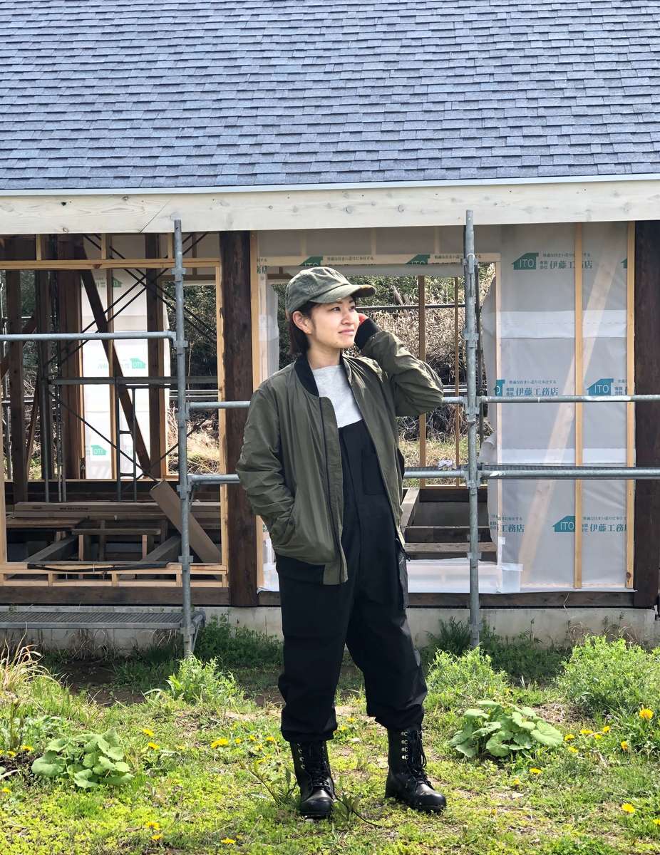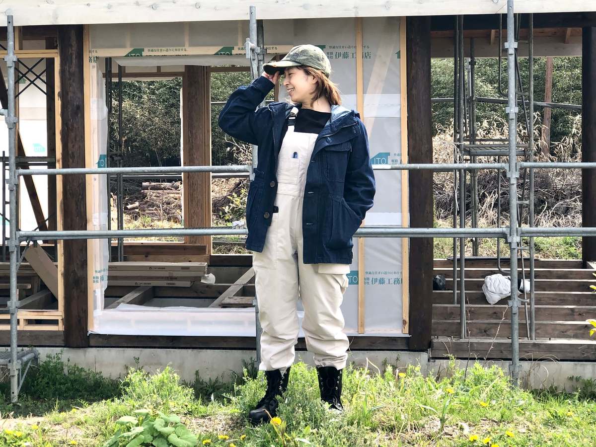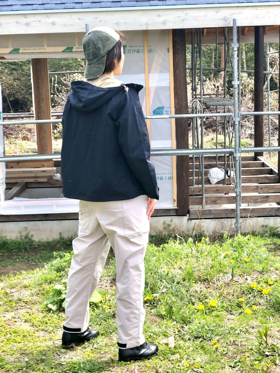 「外壁を塗る作業に入り、白っぽい材料が増えたため、色は汚れが目立たないベージュや白にしました。サロペットの色味が白っぽいベージュのため、アウターはあえて濃いネイビーをチョイス。ワークマンの展示会で実際に羽織り、撥水力を見て気に入ったのも、選んだ理由の1つです」(まっすぅ)