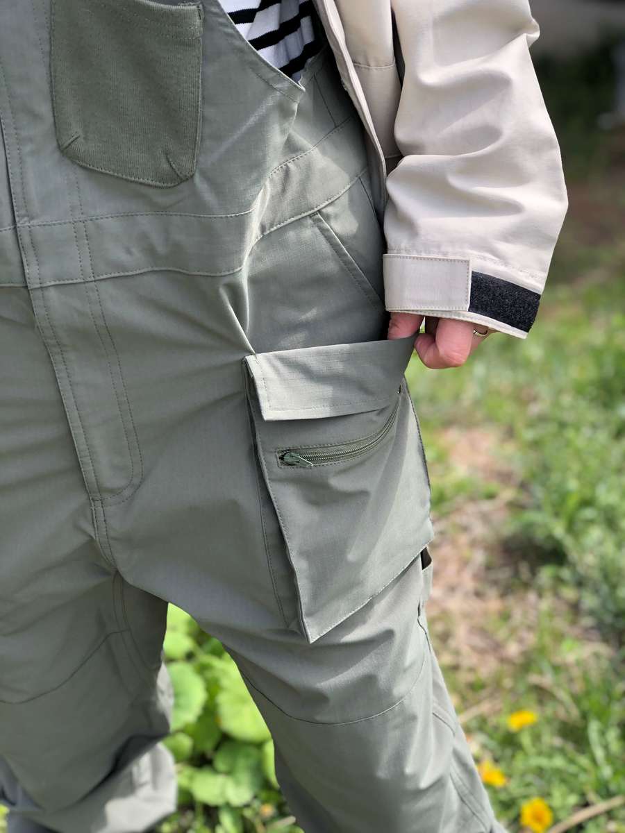 ストレッチ性があるため動きやすく、多数あるポケットは、工具を全て収納できそう。なお、このサロペットも撥水性があります。先日、ホースの水が大量にかかったときも、見事に弾いてくれました。