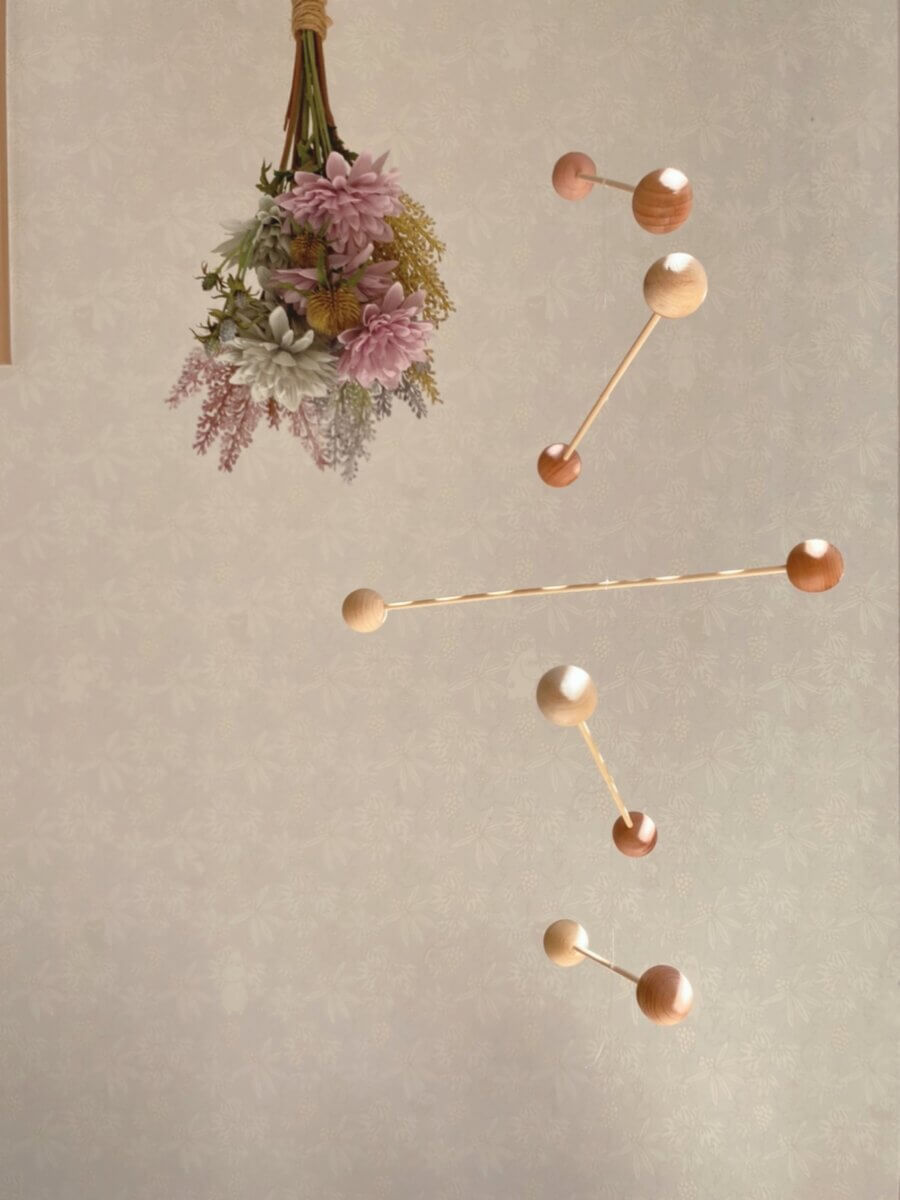 ゆらゆら心地よい揺れが楽しめるウッドモービル。一段一段長さの違うモービルが5段、木の香りもして春の陽気にピッタリなインテリアです。
