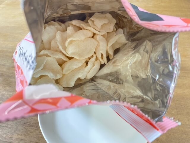 紅生姜せんはポテトチップスではなく米菓なので1枚当たりが大きいため、内容量は90gですが通常の袋菓子よりもパッケージが大きめです。