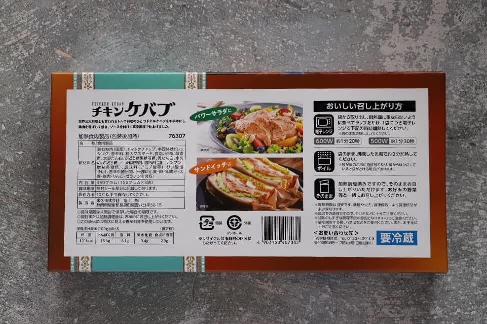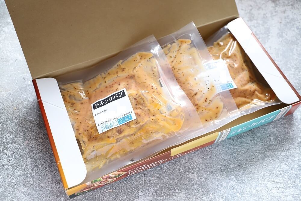 箱を開けてみると、真空パックに入ったチキンケバブが3パック入っています。