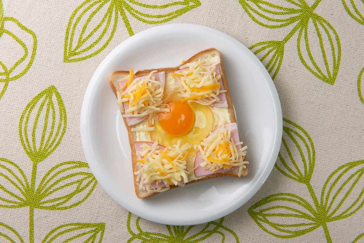 食パンの中心を凹ませ卵1個を入れる。ハム4枚重ねを十字に切り、2枚ずつを食パンの4つ角にのせる。