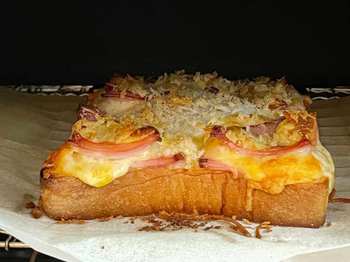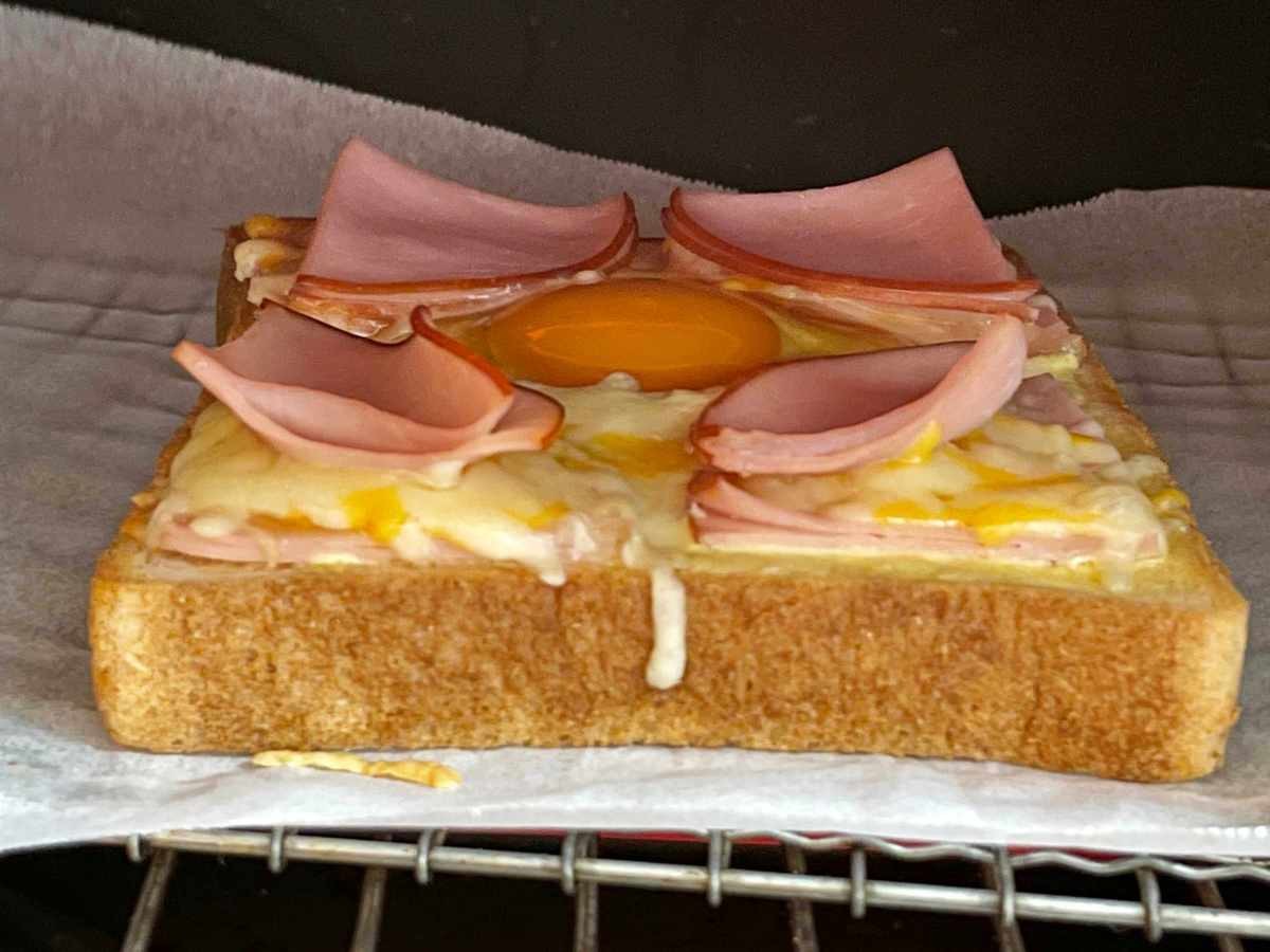 トースターで5分焼く。5分では卵が全く生だったので、7分焼きました。