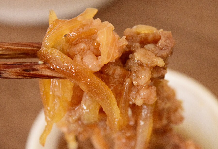 甘辛くてすき焼き風の味付け。お店で食べる場合、温泉玉子を追加トッピングするとまろやかになってすき焼きっぽさが増すかも。