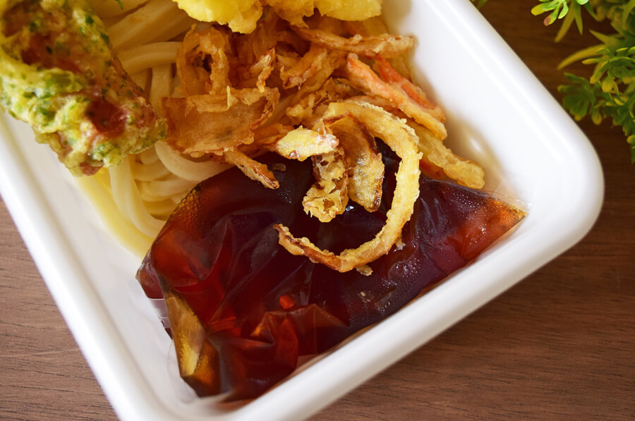 天ぷらは別のお皿に移し替え。というのも、何度か丸亀うどん弁当を持ち帰ってわかりましたが、丸亀の天ぷらはだしに浸かってしまうとべちょべちょになるのです。