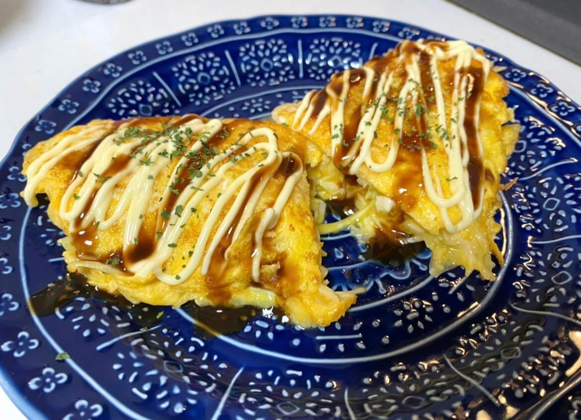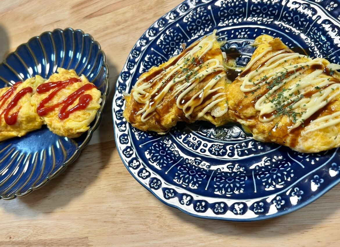 キャベツ×卵と聞くとお好み焼きのイメージがあったので、2つめのオムレツには、お好み焼きソースとマヨネーズ、青のりをちょいかけしてみました♡
