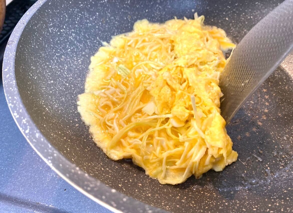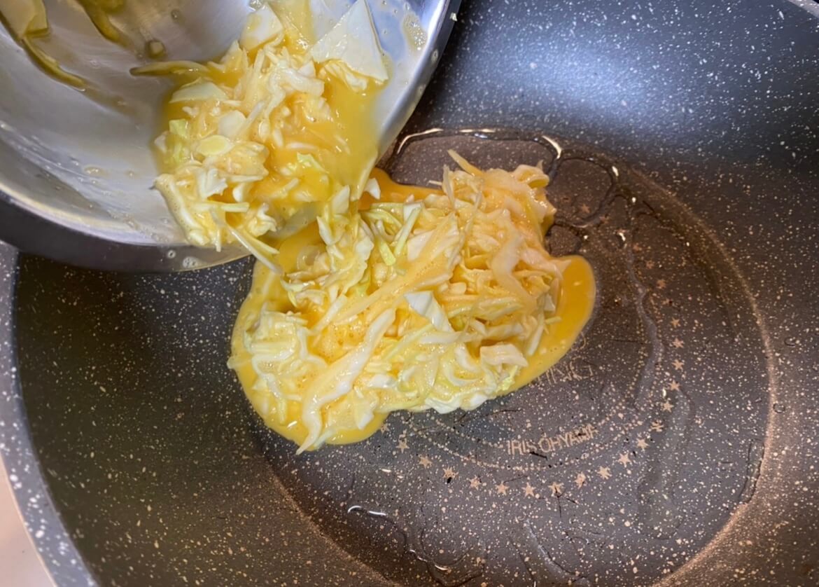 フライパンに油を入れて熱したら、混ぜた卵とキャベツを流し込んで中火で焼いていきます!