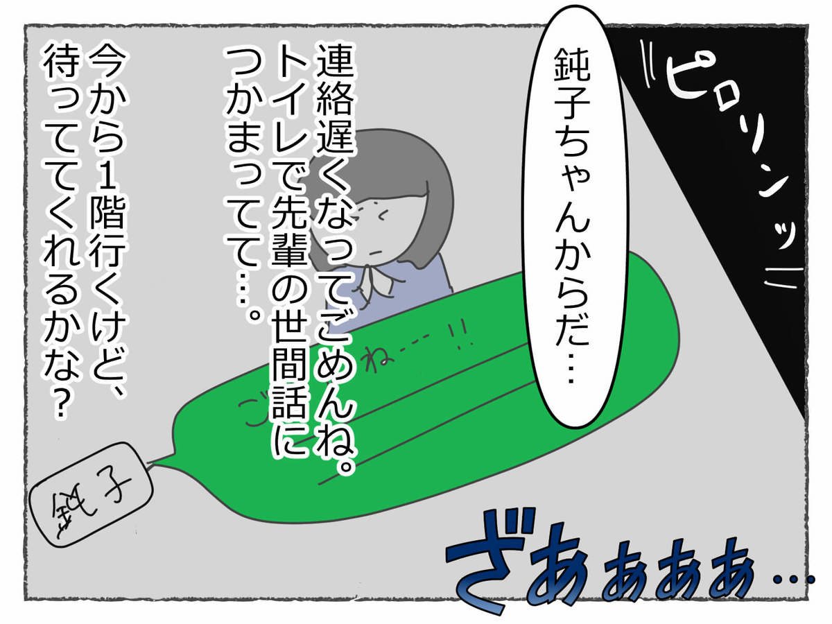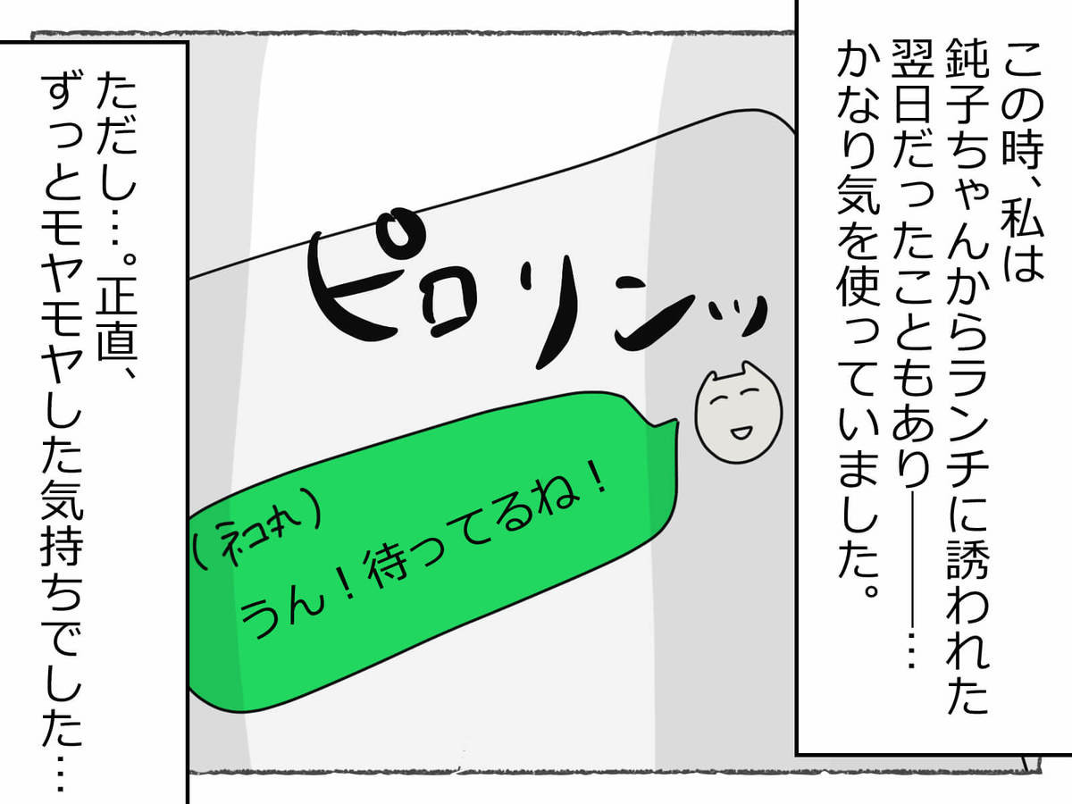 今回は「忌まわしきランチ事件の始まり編」。鈍子の謎の行動に驚きを隠せない作者と同僚の優子。2人とランチで待ち合わせた鈍子の、何を考えているのか分からない、怖い行動とは……!?