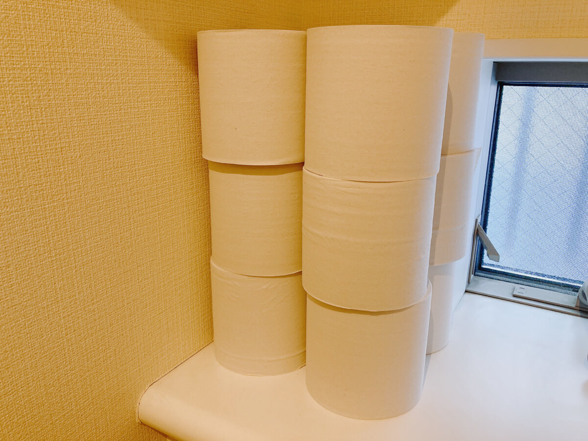 ふつうのトイレットペーパーから「2倍巻き」に変えただけで、災害やコロナにかかったときの備蓄用の買い置きができるようになりました。