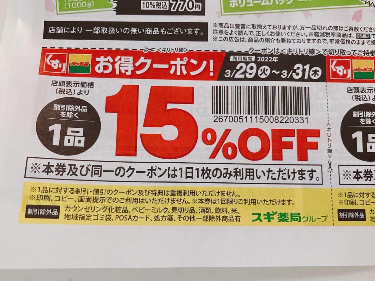 スギ薬局の「15%OFFクーポン」を使うと、通常価格より50円以上お得!