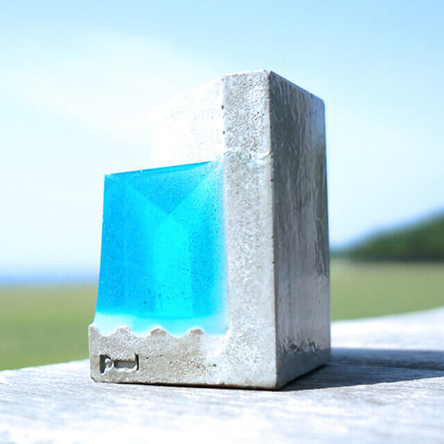 プールのような綺麗なブルーの部分は、日中の太陽光を蓄光して夜に青白く光るんです。サイズは、横60mm・縦60mm・H90mm・重さ260〜270gです。ペンスタンドの入り口は定規も入る三角形。デスクに置くと、スタイリッシュに文房具を立てることができますよ。