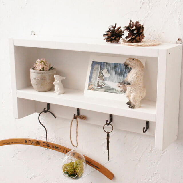 ナチュラルテイストが好き!という方にぴったりな、真っ白カラーがおしゃれな「壁掛けシェルフ」です。上段にはフォトフレームや小物を、下段のフックにはハンガーや紐付きのお掃除用品などを引っ掛けても◎