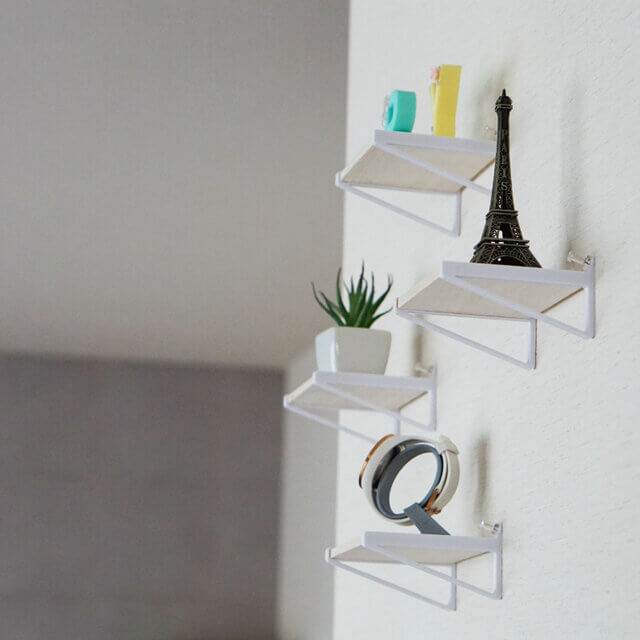 白い壁が飾り棚に?!プッシュピンだけで固定することができる「プッシュピンミニシェルフ」です。お気に入りの雑貨を手軽に飾りたい!賃貸だから大きな穴は空けられない……という方におすすめの作品です。