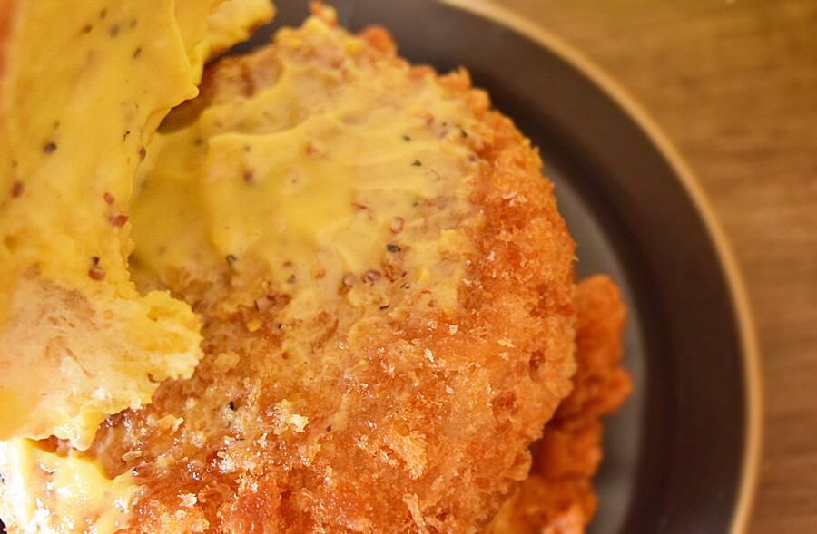 特製ガーリックマスタードソースが、ツーンときます。食べ応え抜群のチキンフィレにハムカツ。