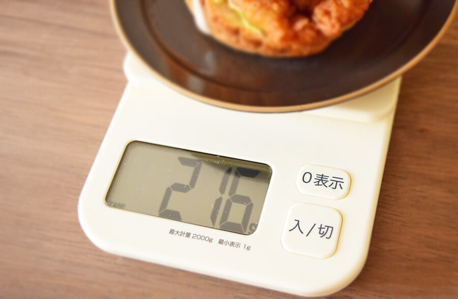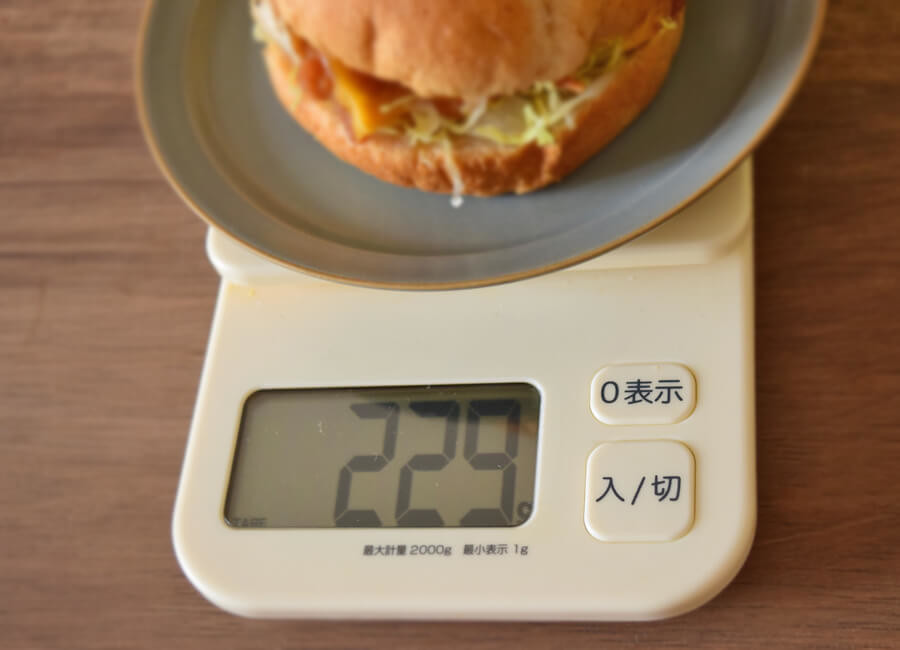 重さは229g(お皿の重さは抜いています)。チェダースライスチーズの分、「極旨ハムカツフィレサンド」よりも重さが出ていますね。
