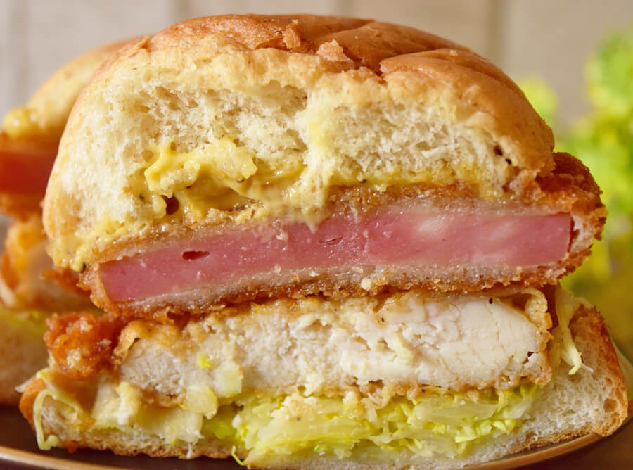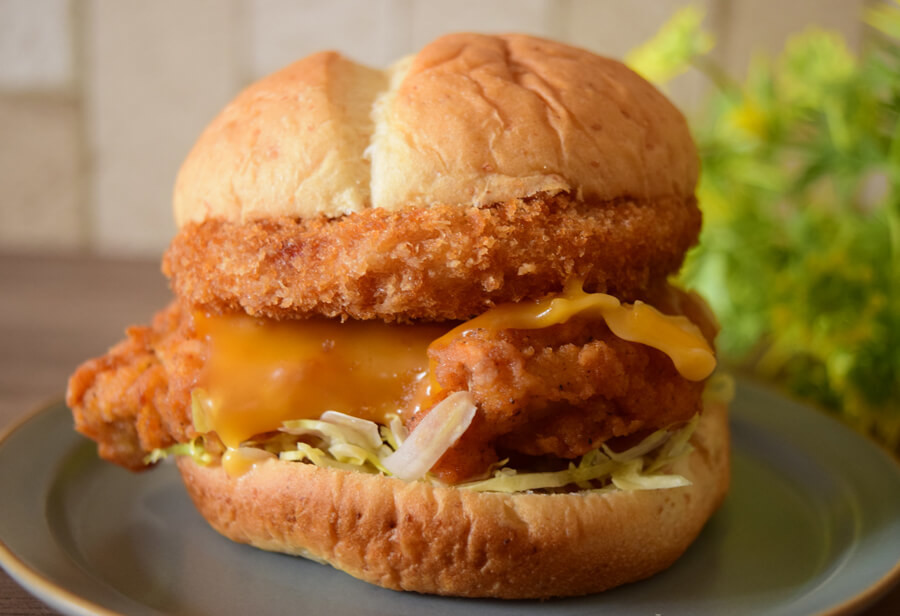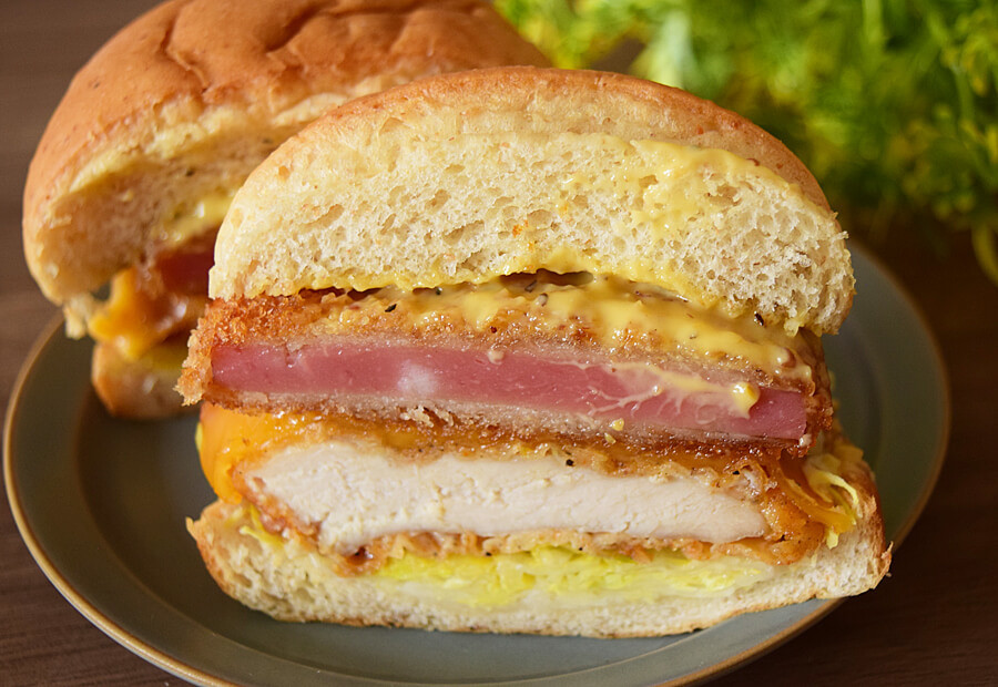 とろけるチェダースライスチーズがチキンフィレとハムカツに絡みあって、素晴らしいハーモニーに。