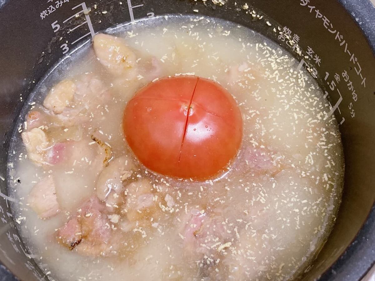 トマトを丸ごと入れちゃう発想も斬新だし、十字に切り込みを入れる事により炊飯後に簡単に潰せてラクチン。