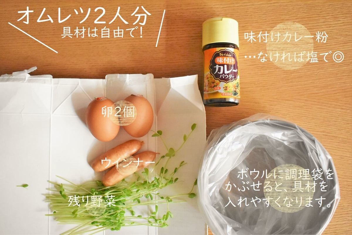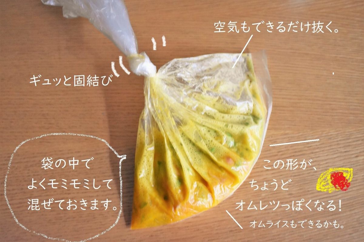 具材をすべて袋に入れて、できるだけ空気を抜いて固結び。モミモミしてよく混ぜておきます。この具材をケチャップライスにしたら、オムライスもできるかもしれません。(今度やってみよう!)