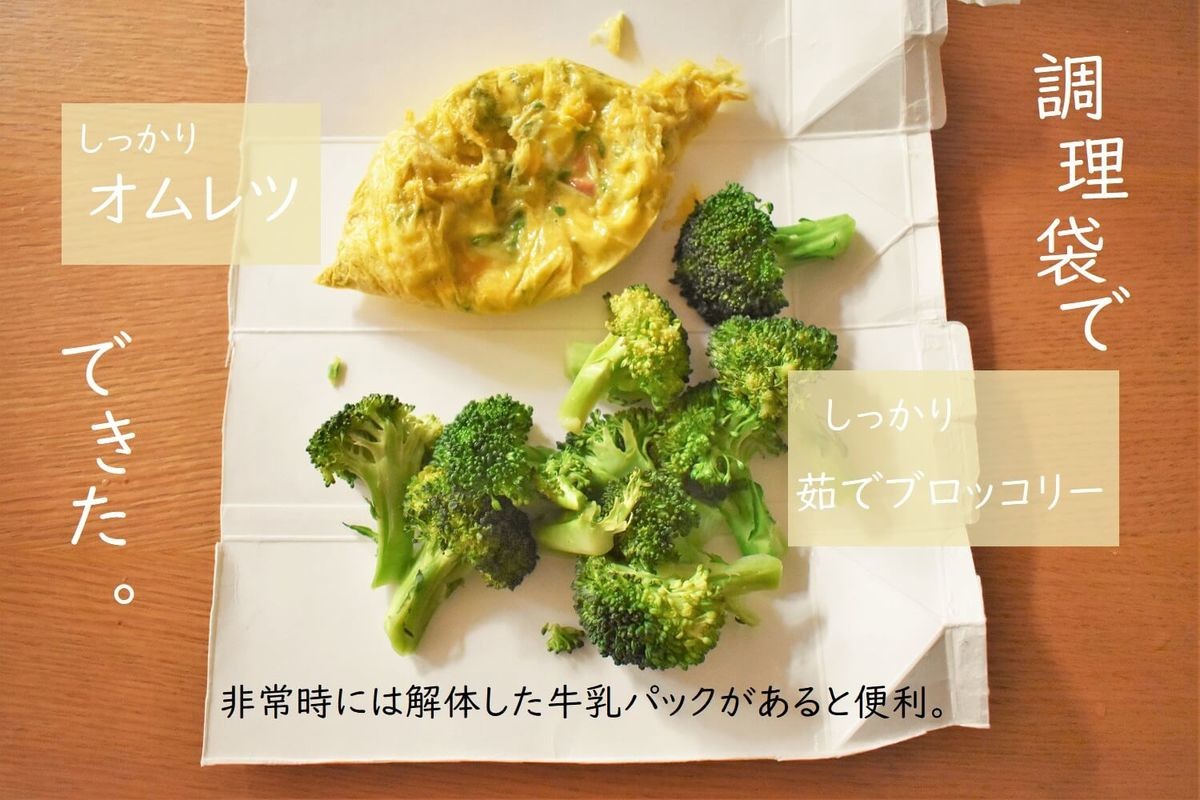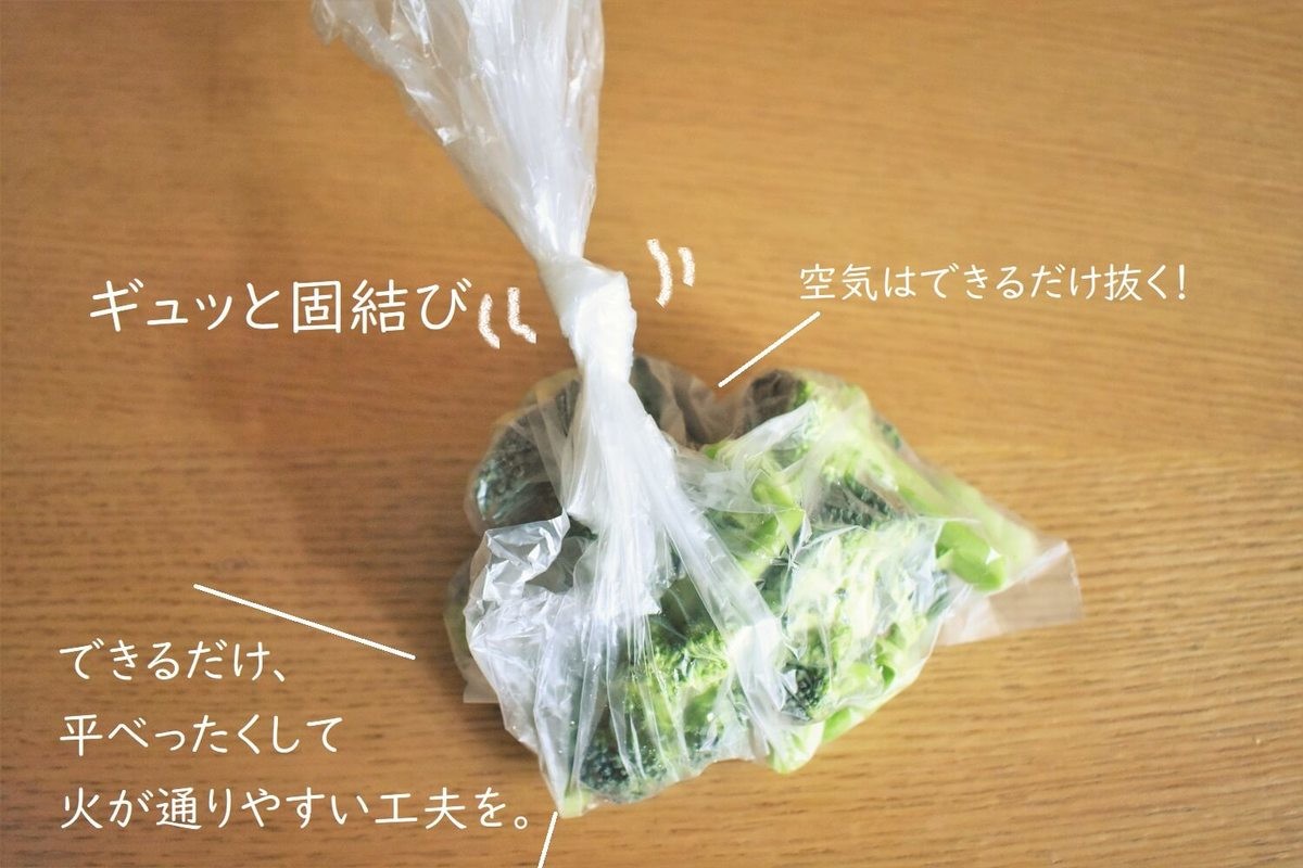 非常時にもできるだけ摂取したいのが野菜。調理用袋で湯せんする場合は、茎の硬い部分がネック。ここに切り込みをいれ、房をできるだけ小さくすることがポイントです。