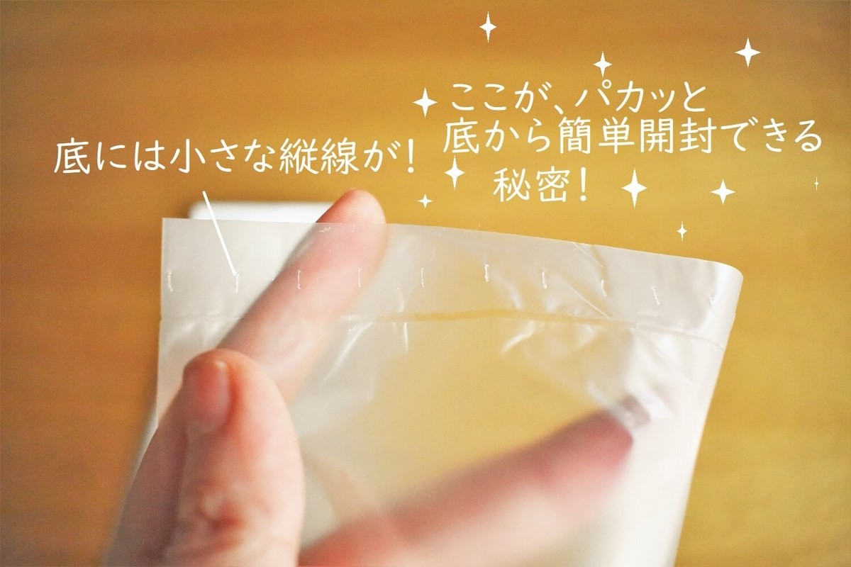 縦線がたくさんついているのが見えますか?実はこれ、穴が空いているんです。軽い力で、底から袋を破ることができるので、上の口は固結びしても大丈夫、ということ!素晴らしい工夫ですね。