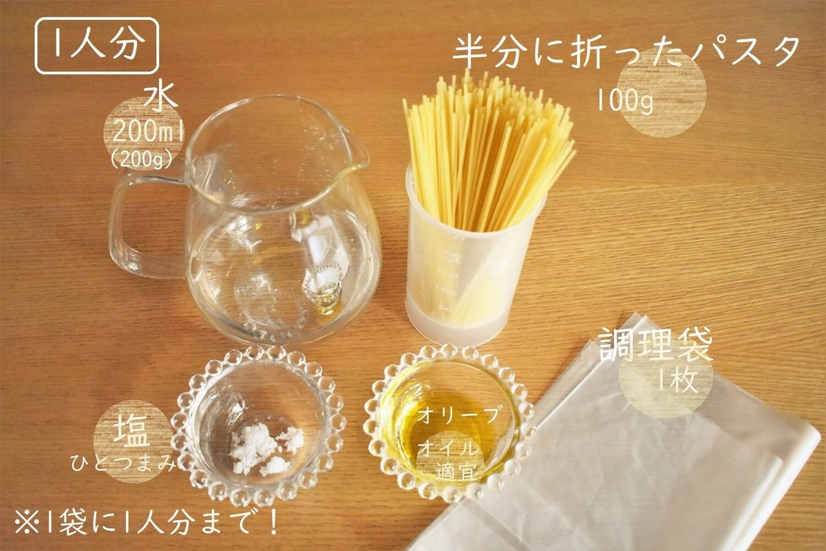 半分に折ったパスタ1人分(100g)に対して、倍の水(200g)+少量の塩と油(サラダ油でもOK)を用意。それをすべて袋に入れて、よくモミモミしておきます。ここでモミモミしておかないと、パスタ同士がくっついてしまうことになるので注意。