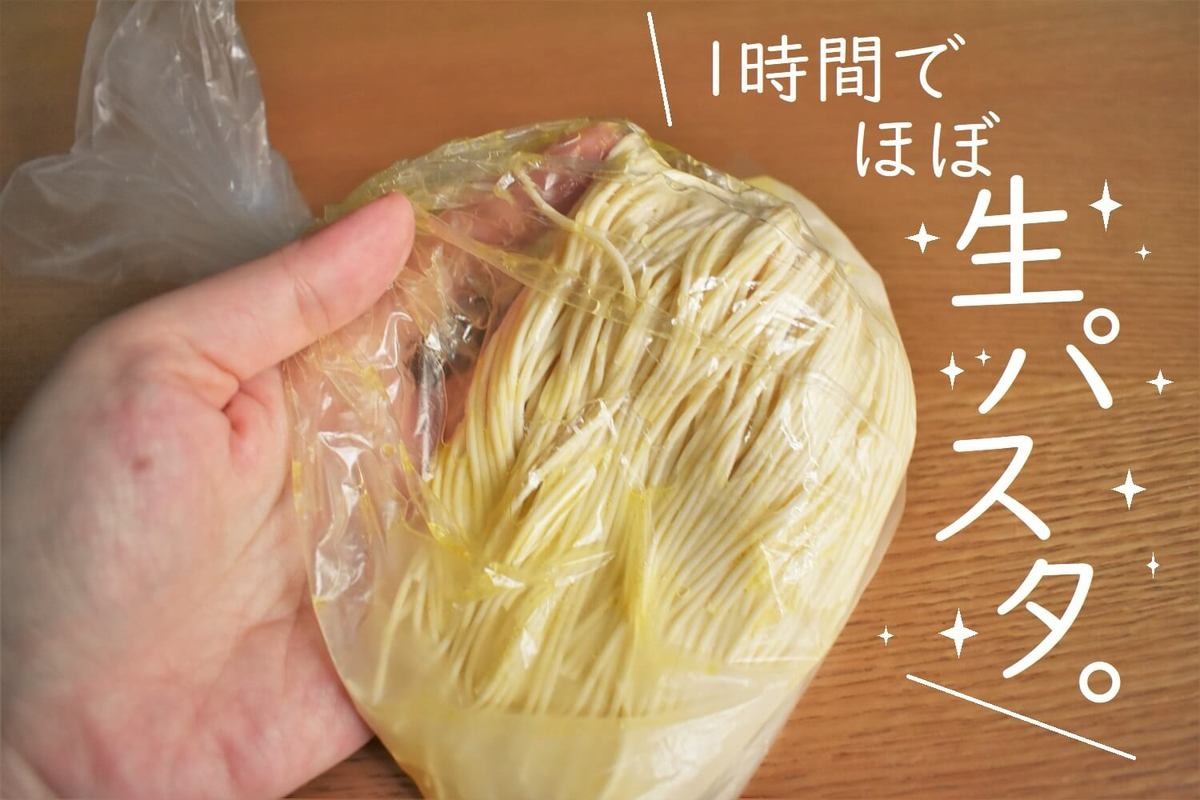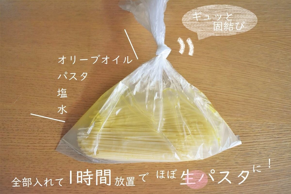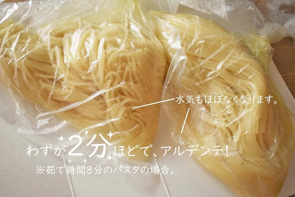 空気をできるだけ抜いて固結びして、1時間程度放置(茹で時間8分のパスタの場合)。