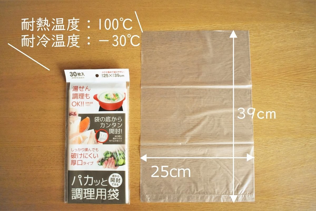 水の沸騰温度100℃まで耐熱があり、耐冷温度も-30℃まであるので、冷凍にも使えます。サイズも、縦39cm×横25cmとなかなか大きいサイズですが、マチはありません。