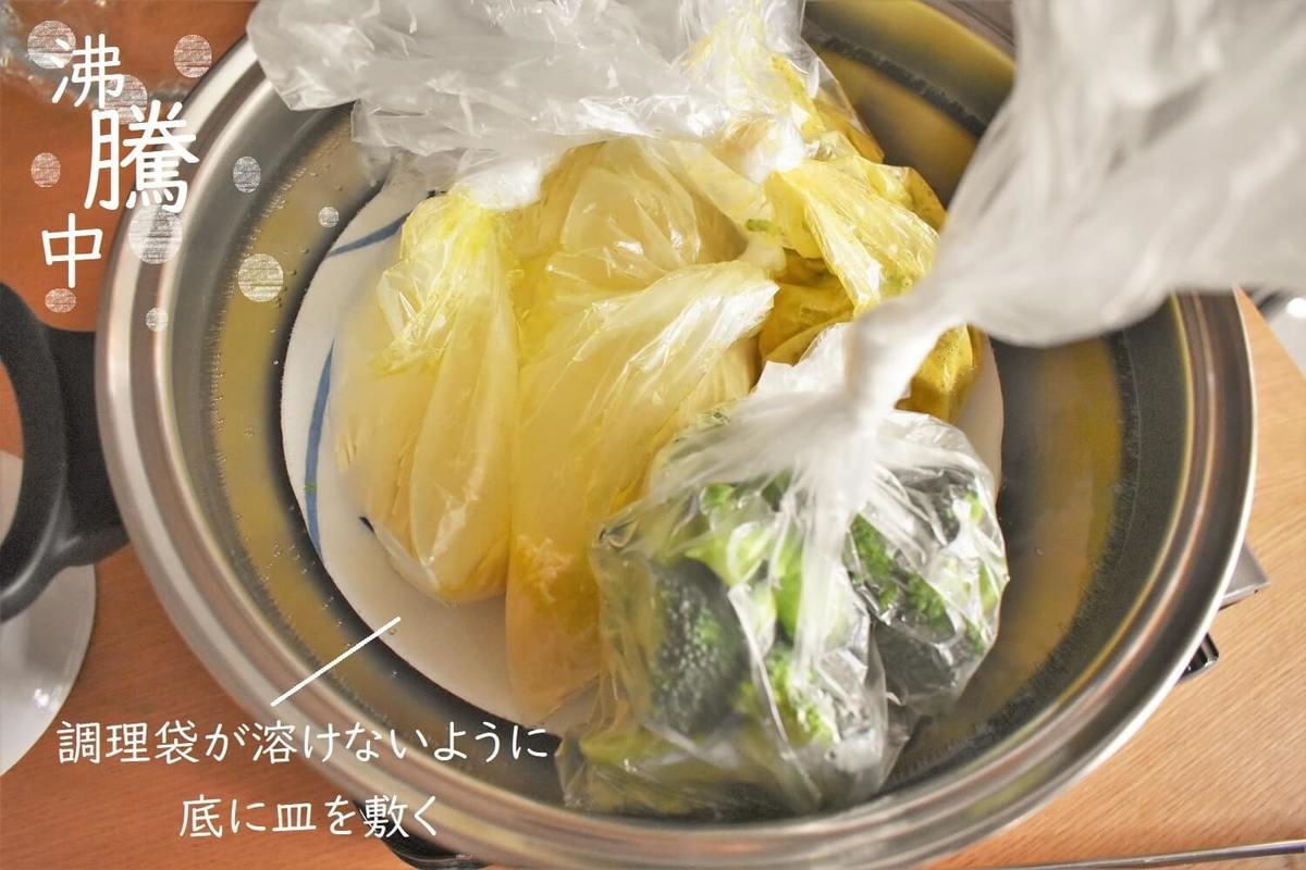 鍋は我が家で一番大きな鍋を用意しました。2リットルほどの水を入れて、沸騰したら鍋底にお皿を1枚沈めます。調理用袋は耐熱温度100℃のため、鍋底のほうが熱く袋が溶けてしまうことを防ぐためです。