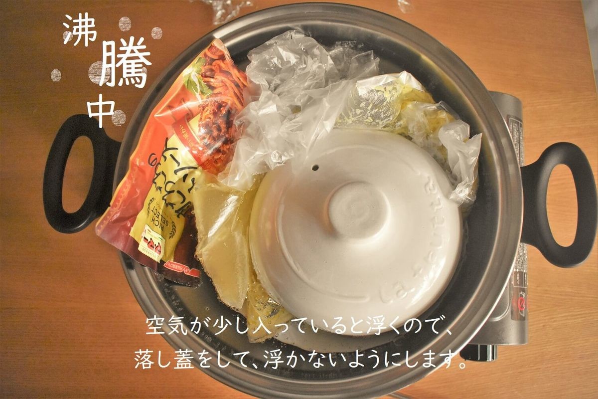 (2)具材の入った袋を鍋に入れ、落とし蓋をする