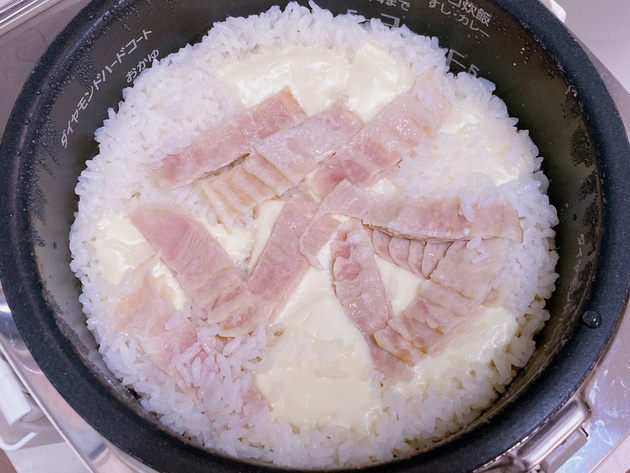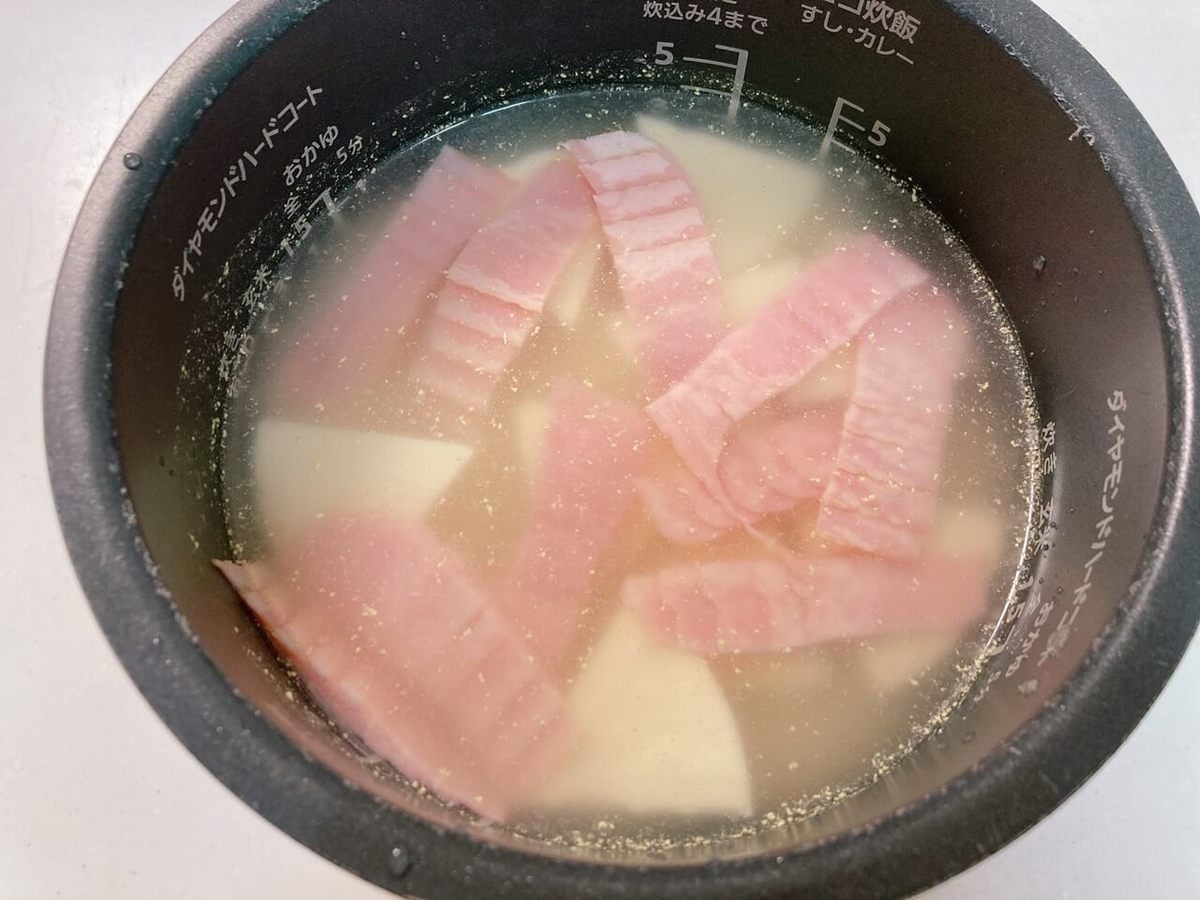 ベーコンもキッチンバサミでカットするだけだし、細かく具材を切り分ける炊き込みご飯と違い、かなりストレスフリーで有り難いです。