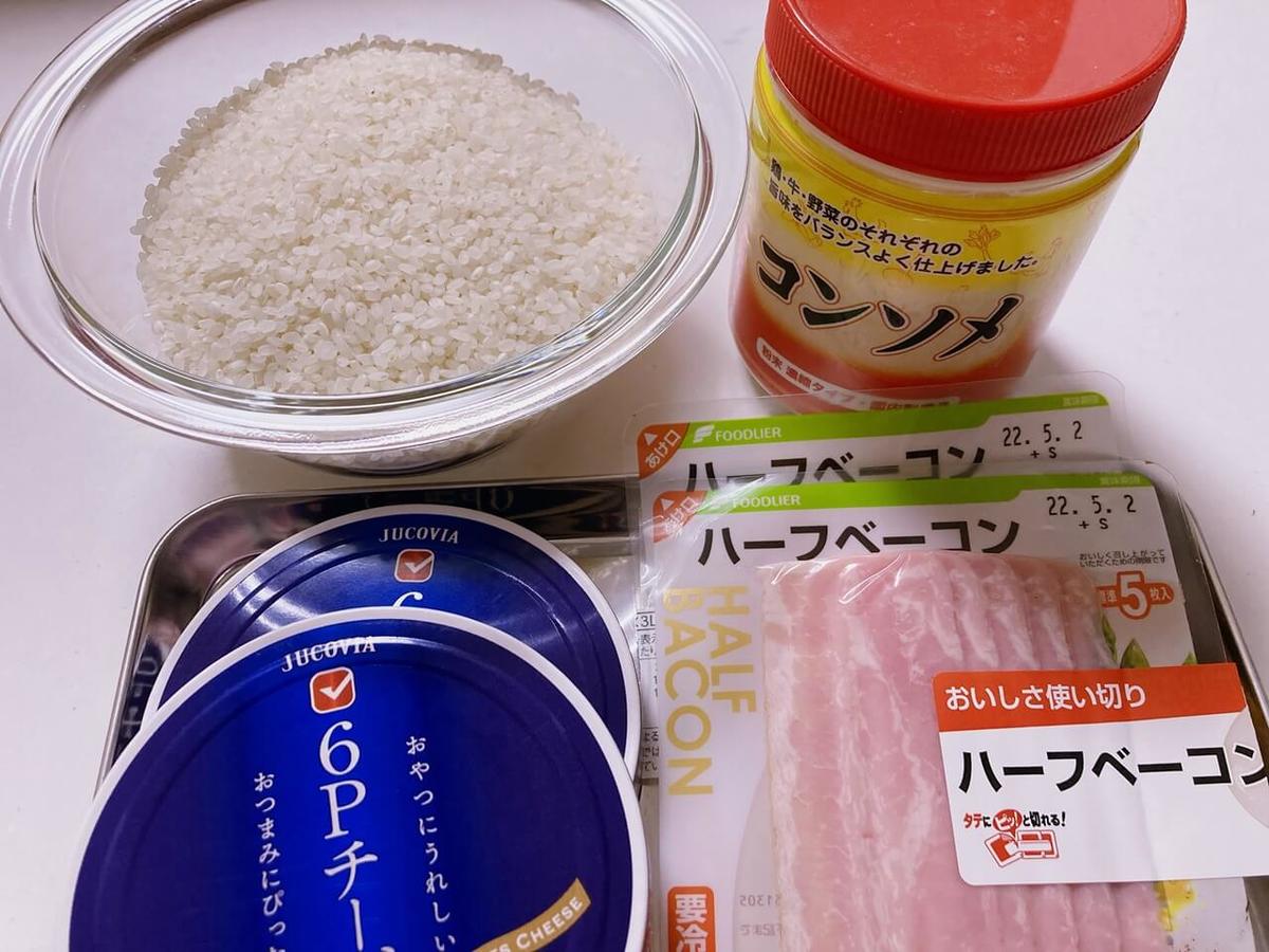 べーコン、顆粒コンソメ、6Pチーズ、すべて業務スーパー購入品です♪ 材料もすぐ手に入る&少なくて済むし、子どもや女性が大好きなチーズたっぷりで休日ランチに最適だと思います。