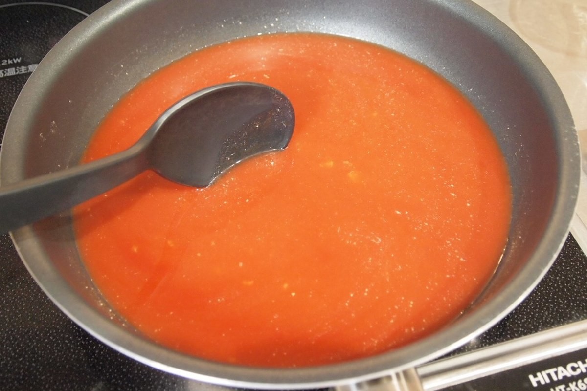 フライパンにトマトジュース・水(180ml)・鶏がらスープの素・レモン汁・おろしニンニクを加えて中火で温めます。
