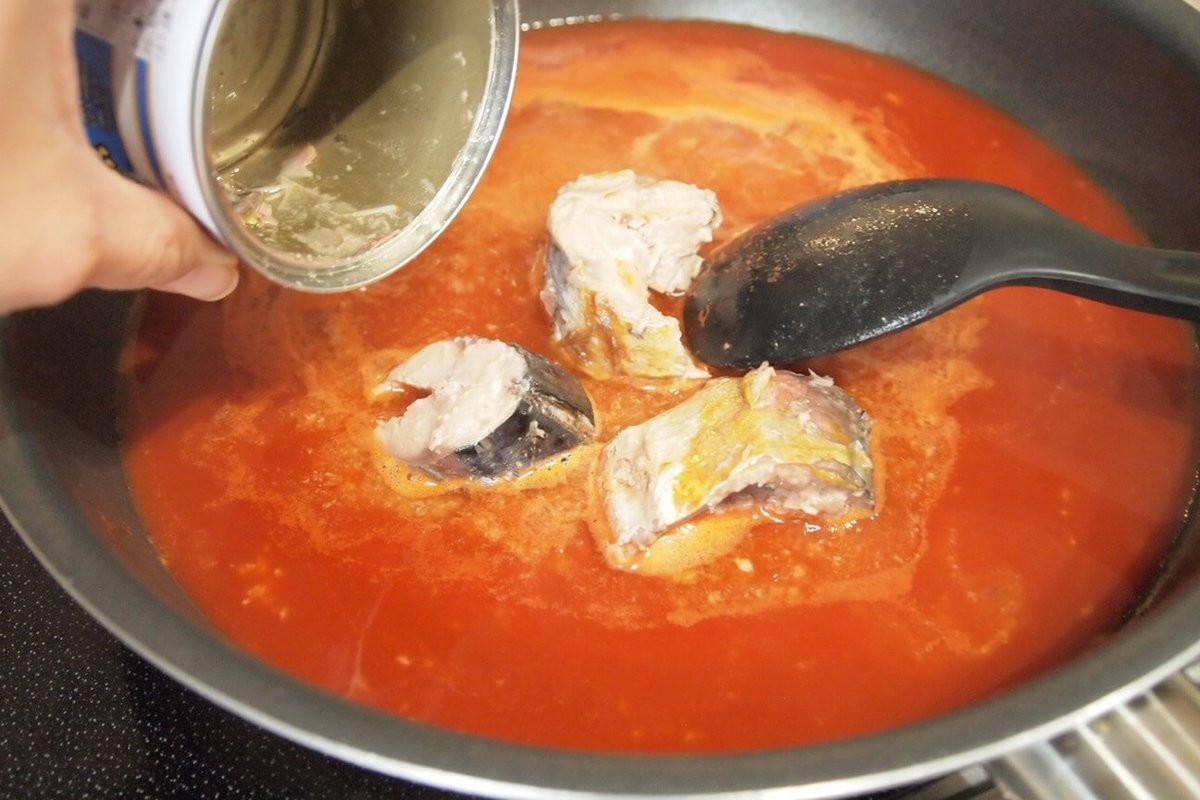 サバ缶レシピ②サバ缶を汁ごと加えて煮込む