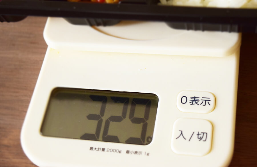 重さを計測したところ、329g(容器の重さ込み)。ガッツリ系弁当ではないものの、めちゃくちゃ少ないわけでもない。