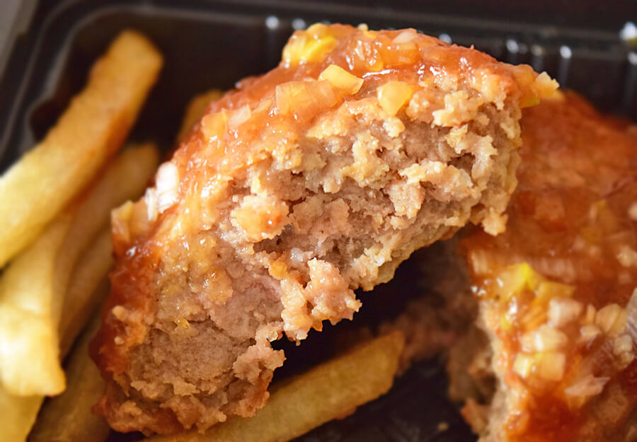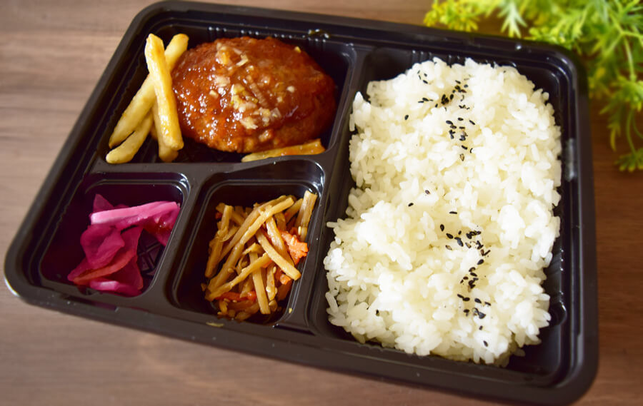 弁当の内容は、ごはんに玉ねぎソースがかかっているハンバーグ、フライドポテト、きんぴらごぼう、ピンク色のたくあん。ごはんはやや固めで、おかずの味はいわゆるスーパーのお弁当といったクオリティ。