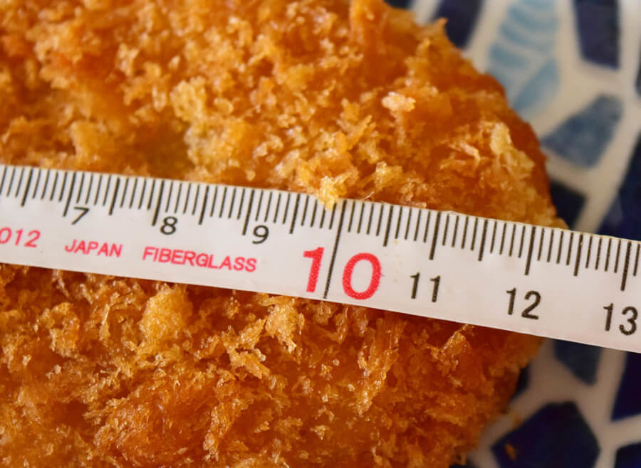 長さは約12cm。個人的には一般的なスーパーのコロッケよりも一回り大きいと思いますが、みなさんはいかがでしょうか。このサイズで約70円は嬉しい。