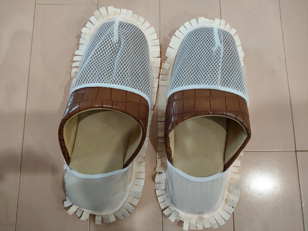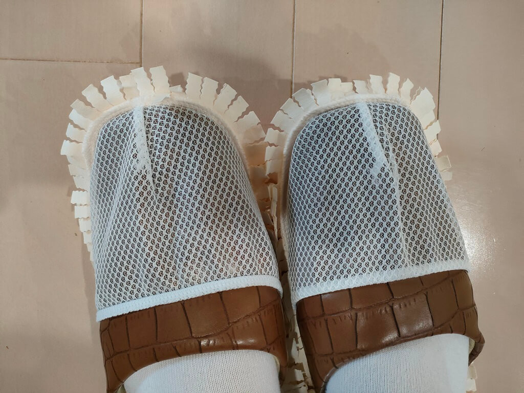 早速フロアクリーナーを、自前のスリッパに装着してみることに。ただ、筆者が持っていたスリッパは滑り止めの付いているタイプだったので、装着するのにやや手こずりました。