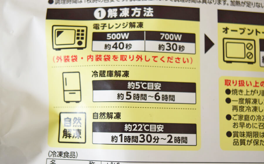 調理には、解凍→焼くといったステップを踏みます。私は電子レンジで解凍をして、オーブントースターで焼きました。別の日では、冷蔵庫で解凍→オーブントースターで焼く、といった別の調理方法で作りました。