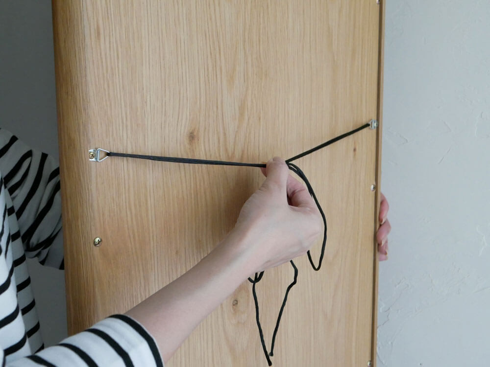 「スタンドミラー」裏面は金具が2ヶ所に設置されているので、付属の紐を通して壁に固定することも。
